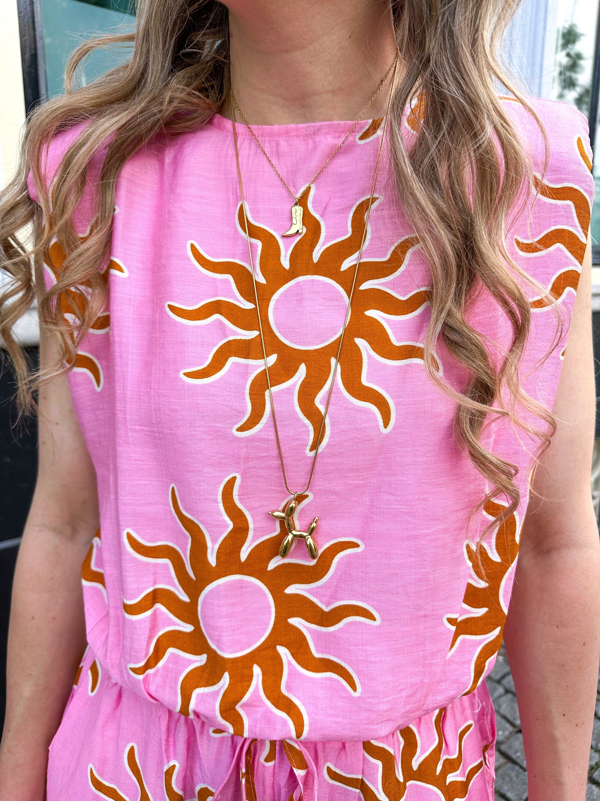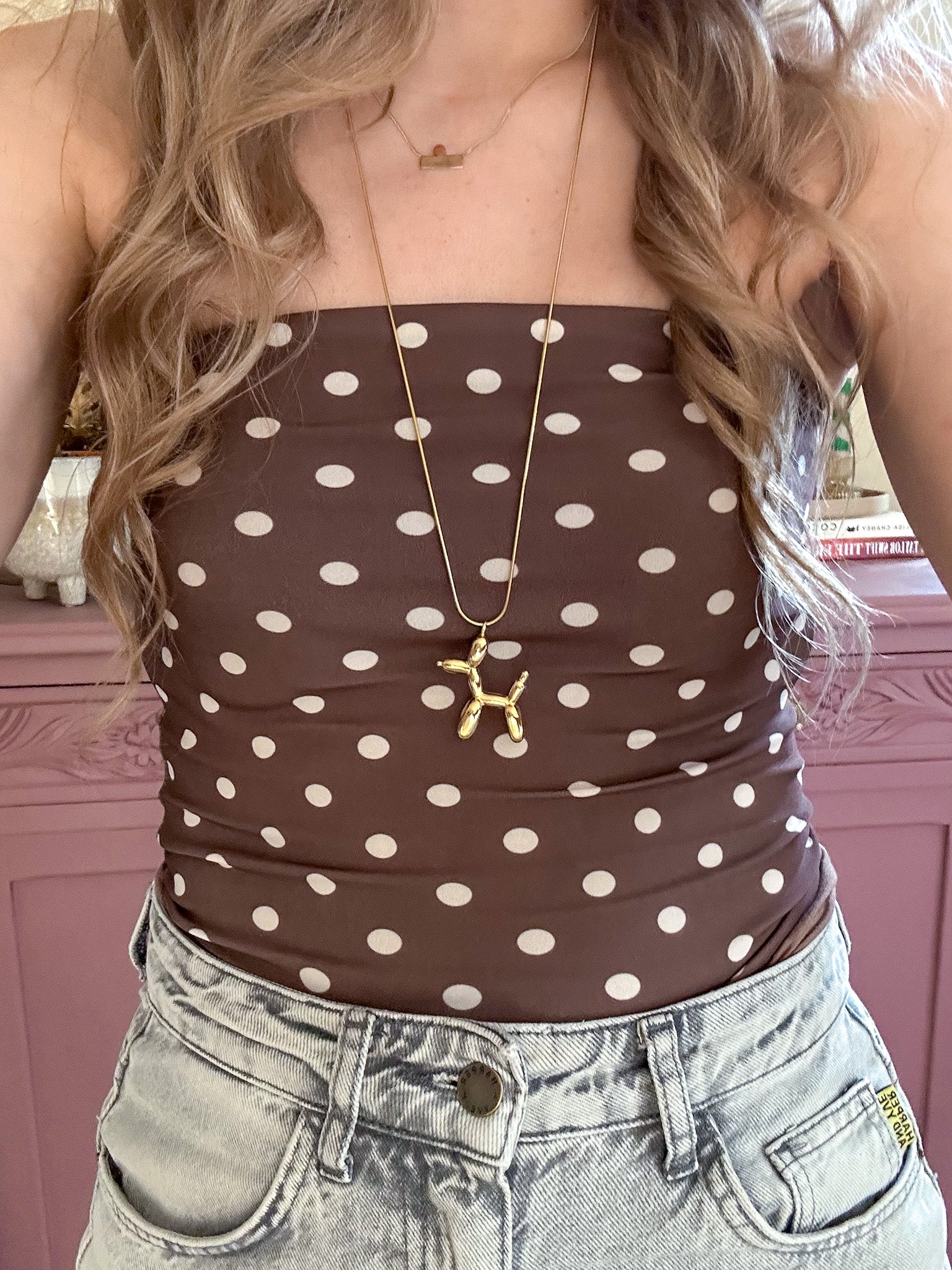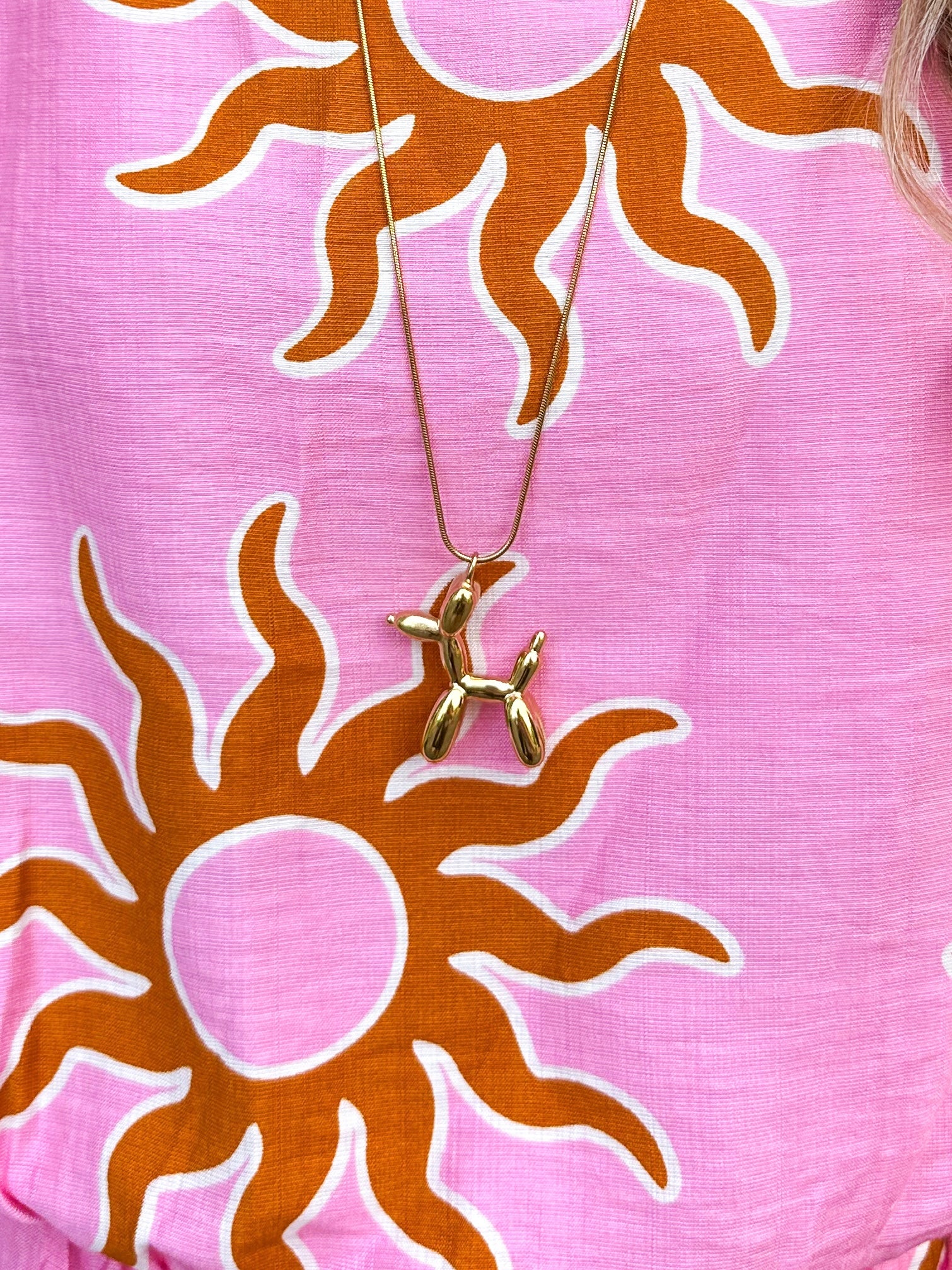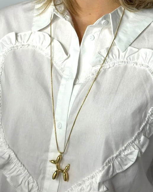 Goudkleurige stainless steel lange ketting met een ballon hondje eraan. Deze mini opgeblazen puppy geeft jouw outfit een extra cute uitstraling. Het voordeel aan een lange ketting is dat je deze heel makkelijk kan layeren met andere kettingen voor een leuke necklace party.