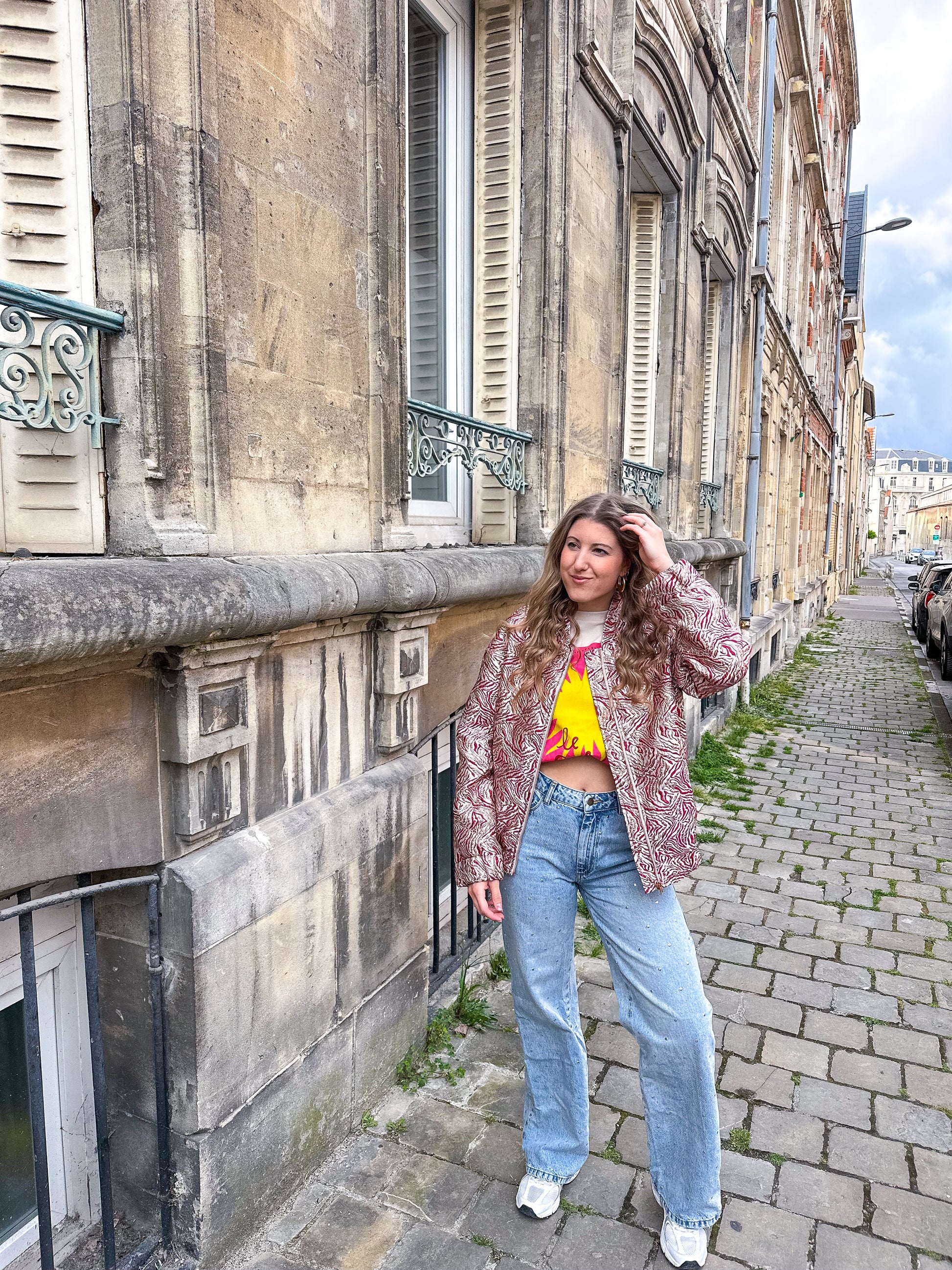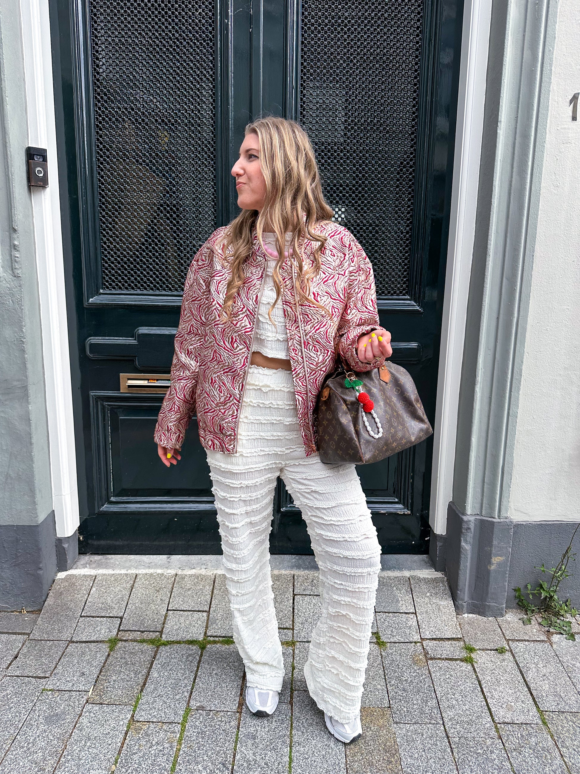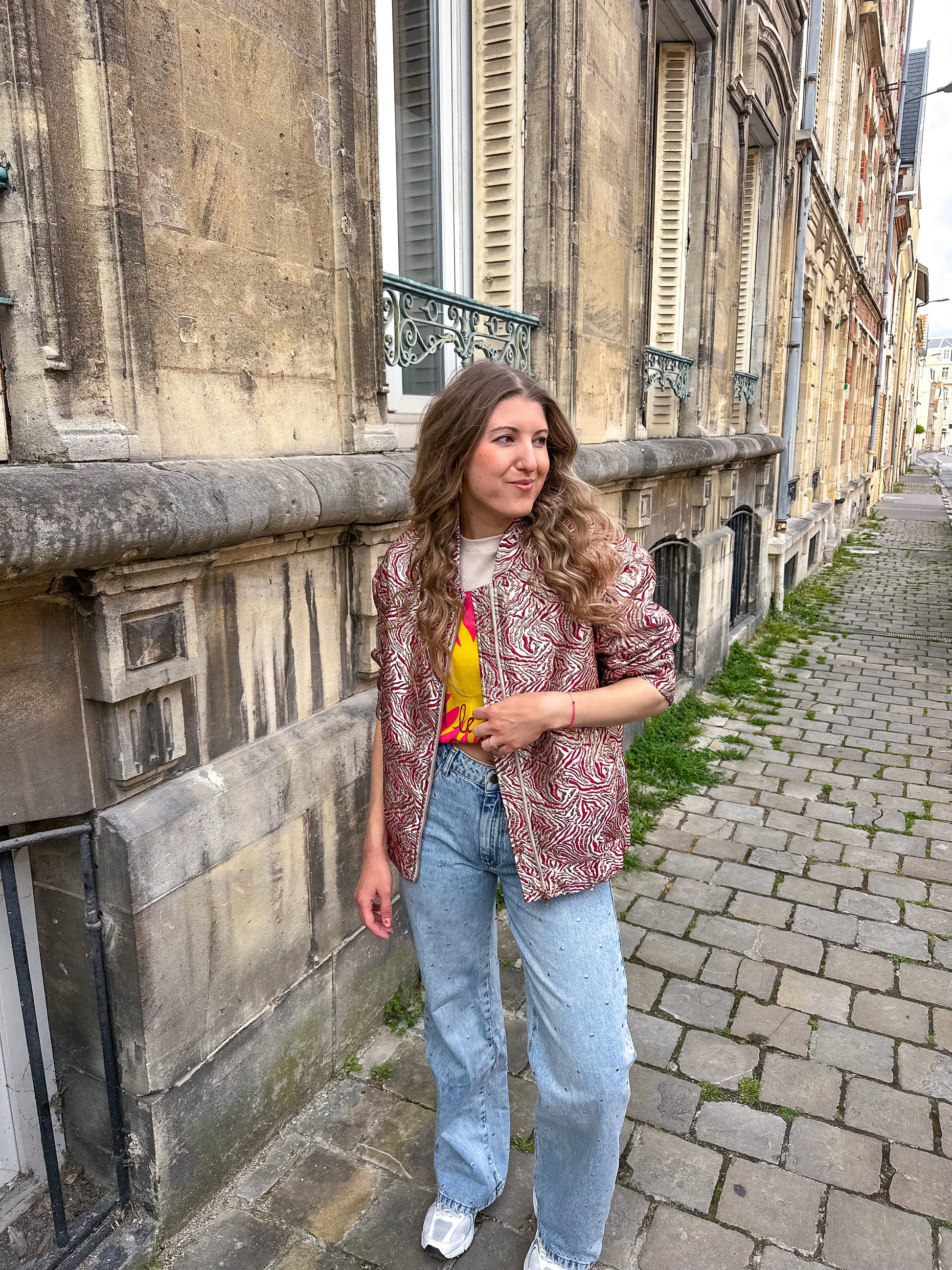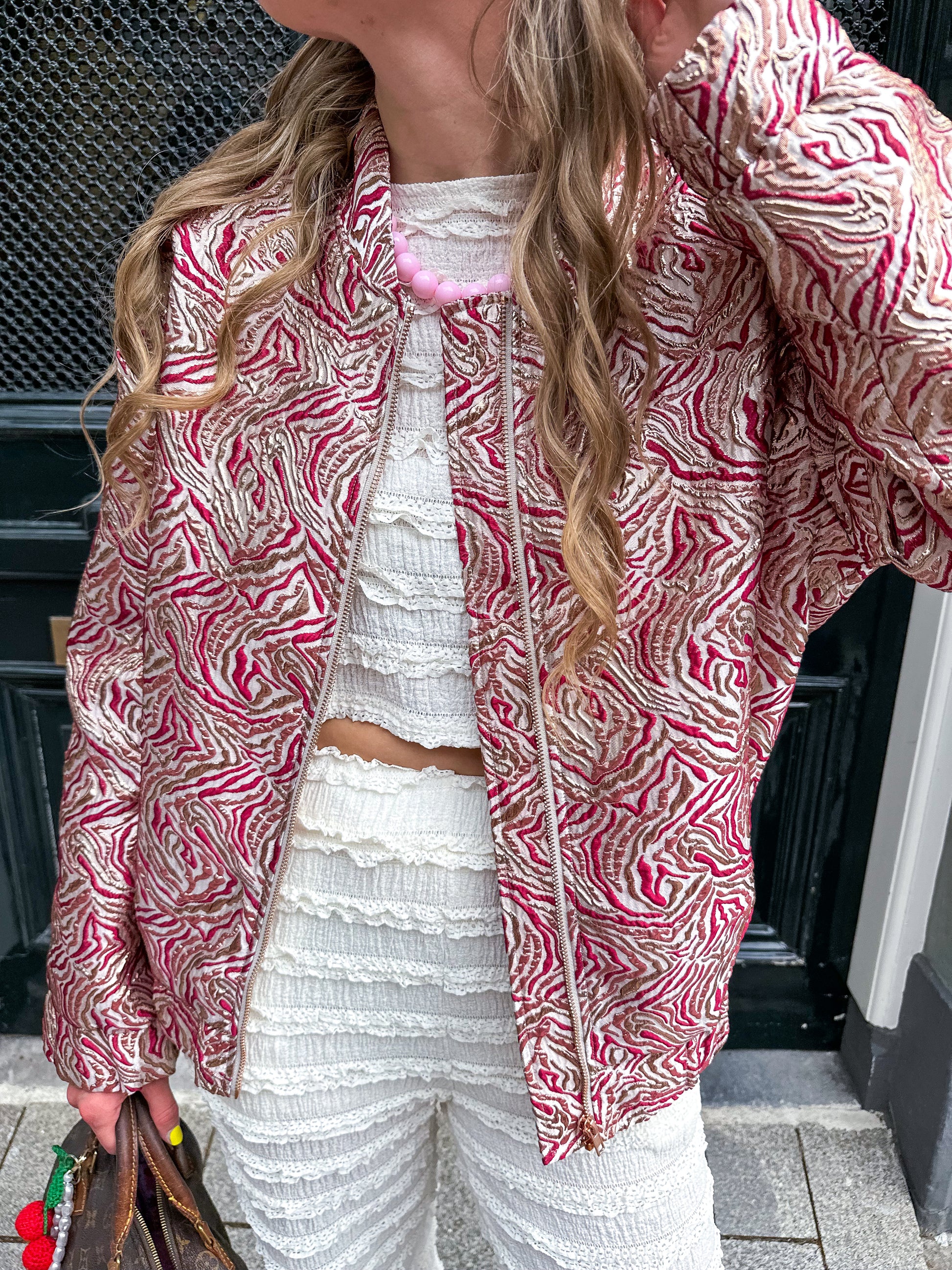 Dit bomber jasje heeft een rood/roze/gouden print die ons doet denken aan onze chili peper. Wanneer er licht op de gouden details valt glinsteren deze. Deze IT bomber is perfect voor een stoere look. Dit jasje heeft een rosé gold rits welke zorgt voor een ronde hals wanneer deze dicht zit. Op warme dagen perfect als jasje en op koele dagen als outfit piece.