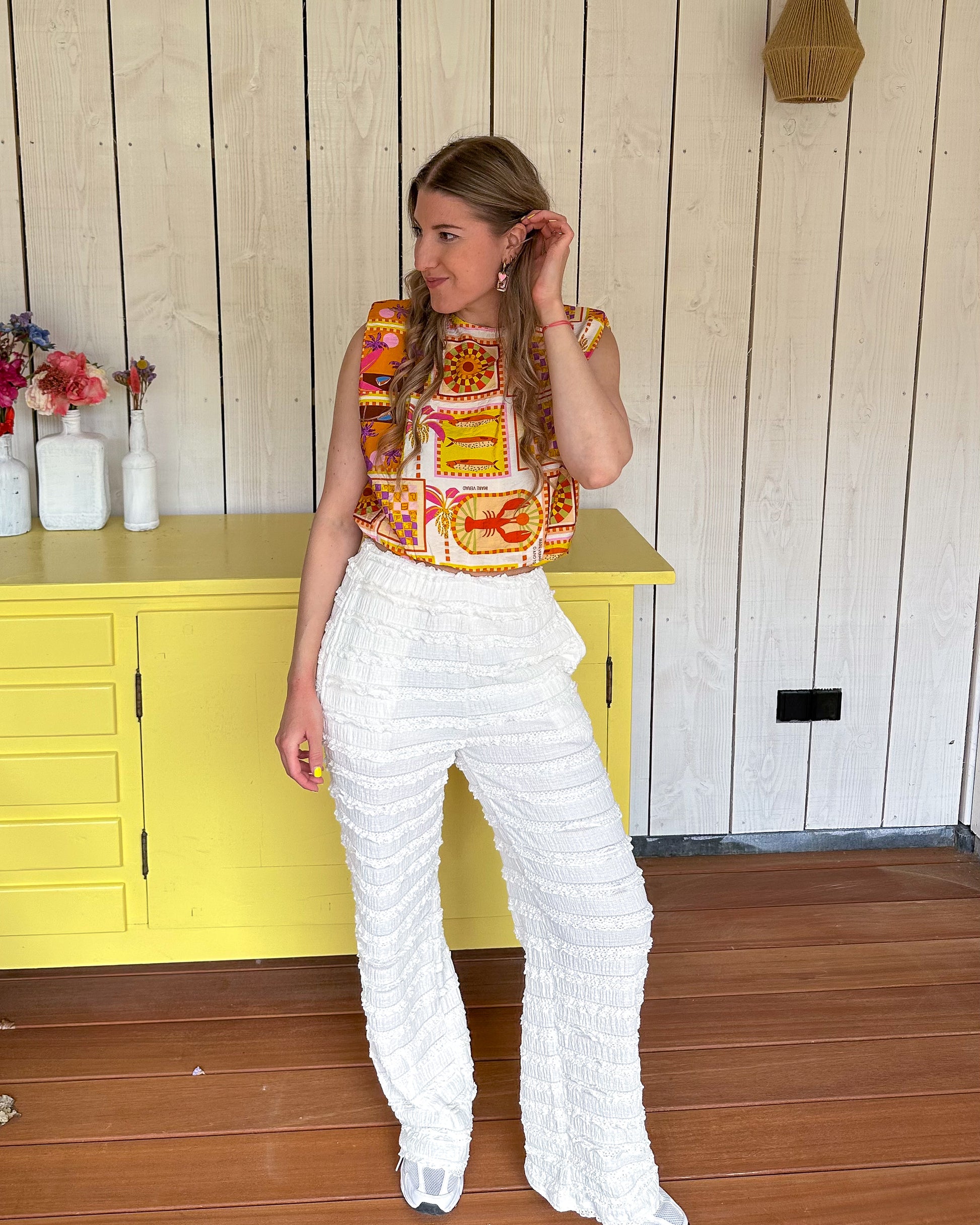 Deze mooie ruffle broek heeft kanten details. De broek geeft een zomerse look en is perfect te combineren met de bijpassende ruffle top. Maar ook heel leuk met een ander t-shirt of top.