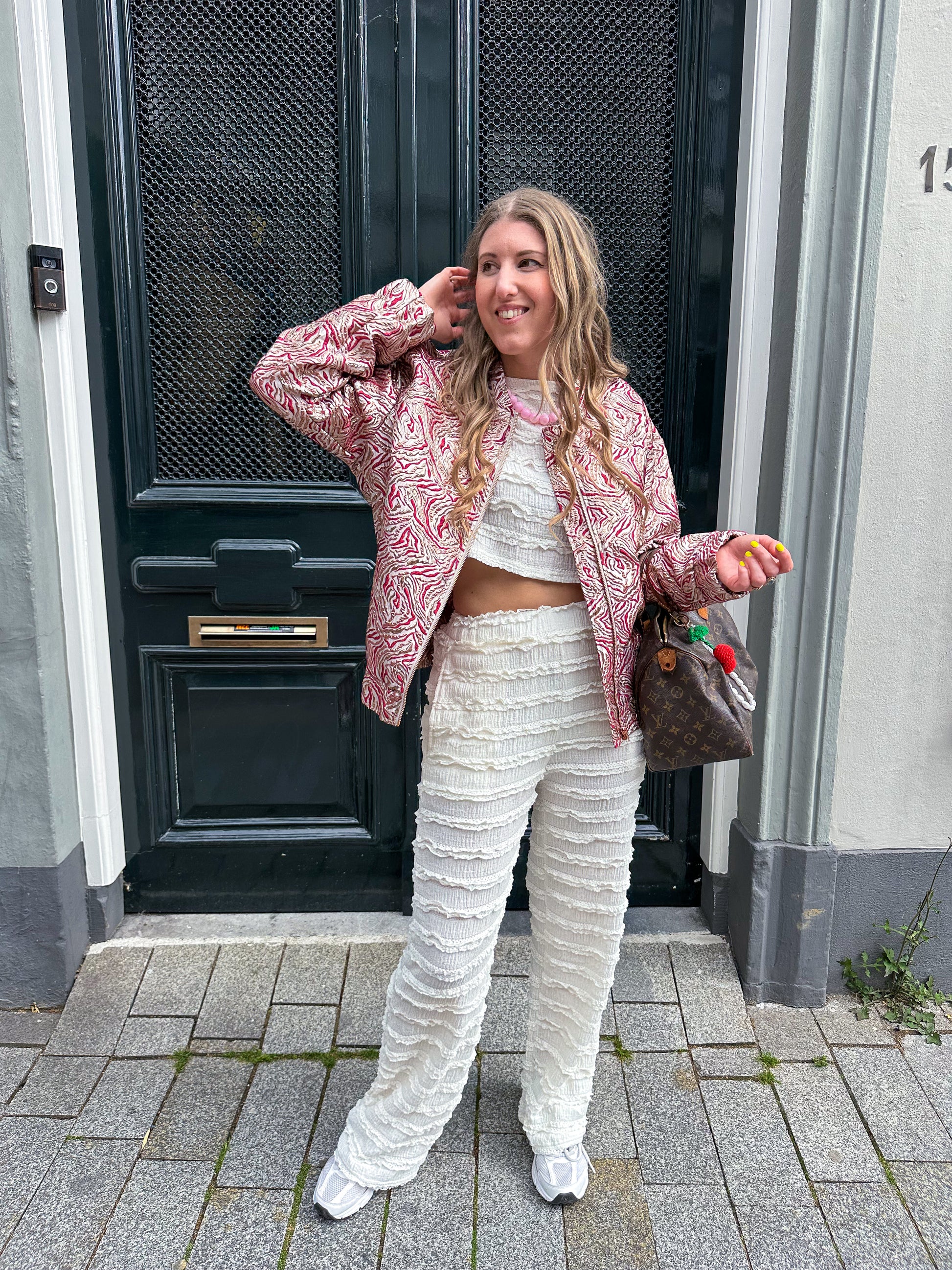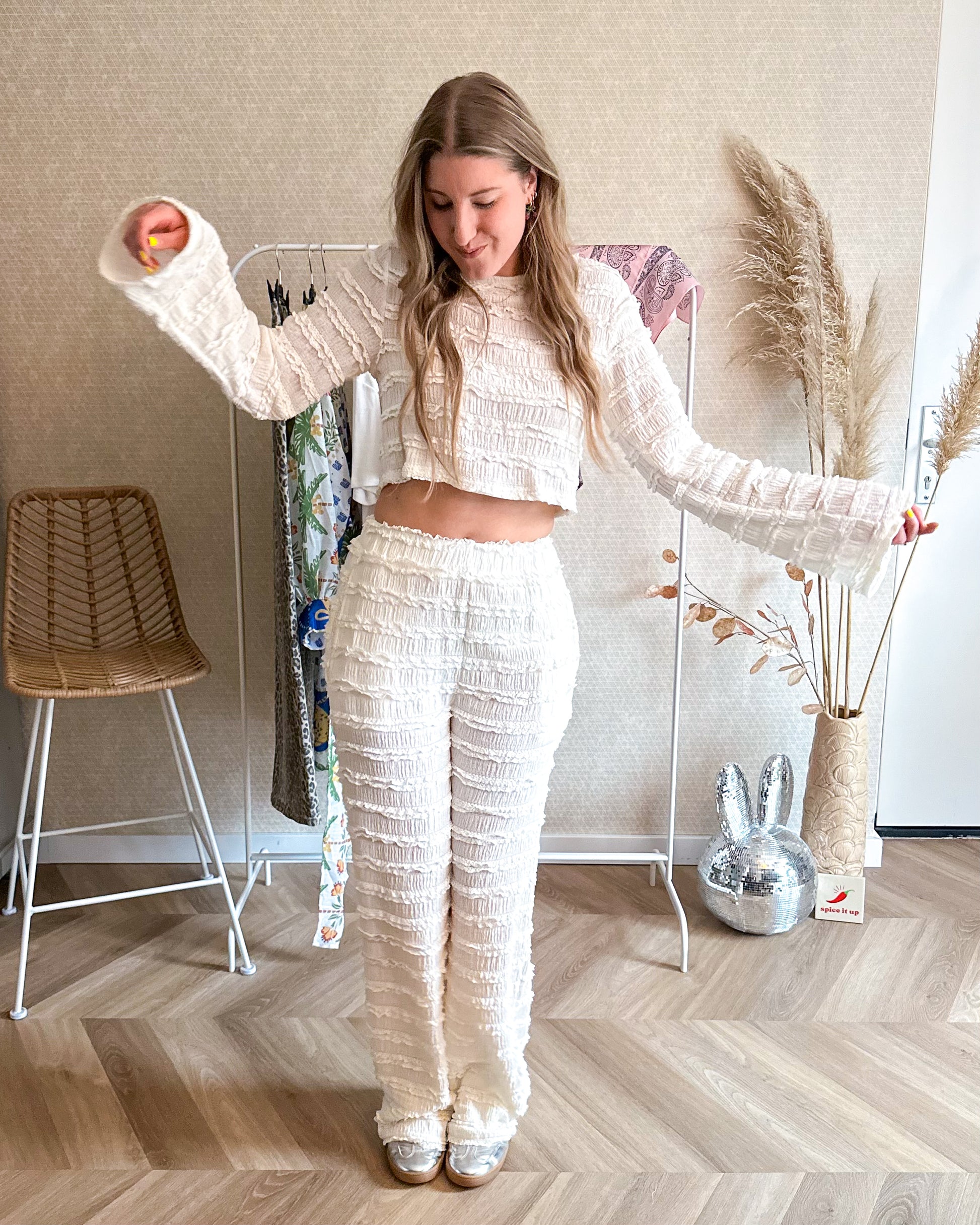 De broek heeft en witte kleur en twee steekzakken. Sanne is 1.71 en draagt maat S.