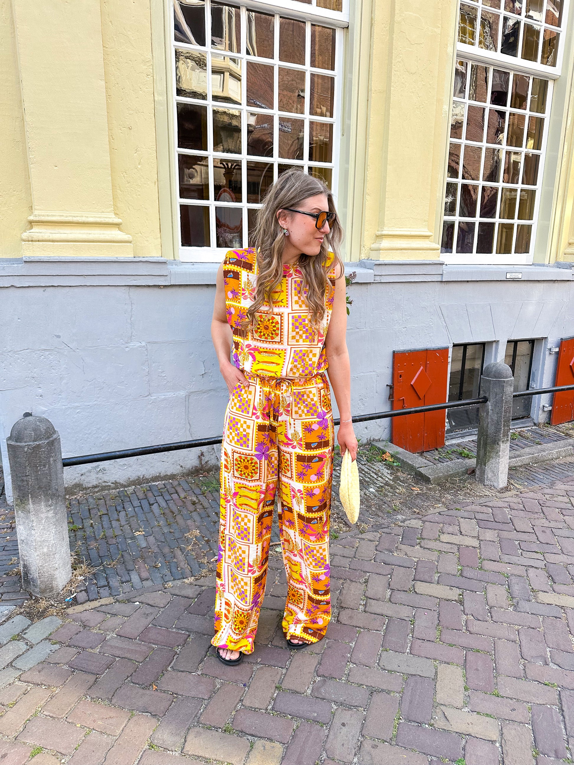 Deze luchtige broek is onderdeel van een super leuke co-ord set met bijpassende top. De broek is lang en heeft een elastische band met trekkoord. De gele mediterranean print bestaande uit vissen, palmbomen en kreeften geeft een zomerse look.