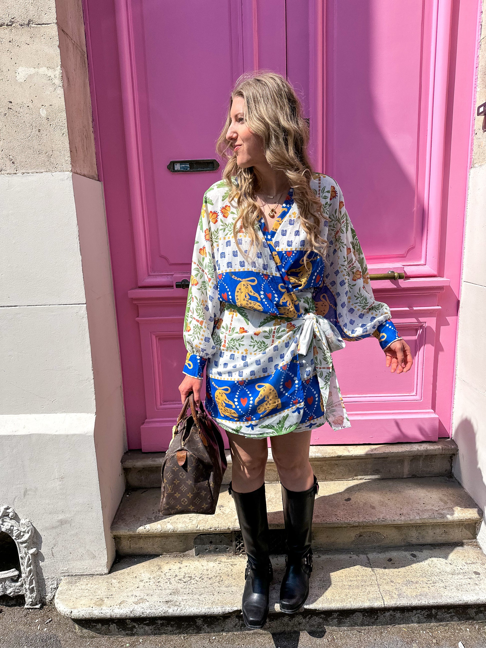 Dit luchtige wikkel jurkje is perfect voor de zomer en voor je vacay. De kleurrijke print met panter details is helemaal on trend. Draag stoer met sneakers of style af met laarzen of hakken.