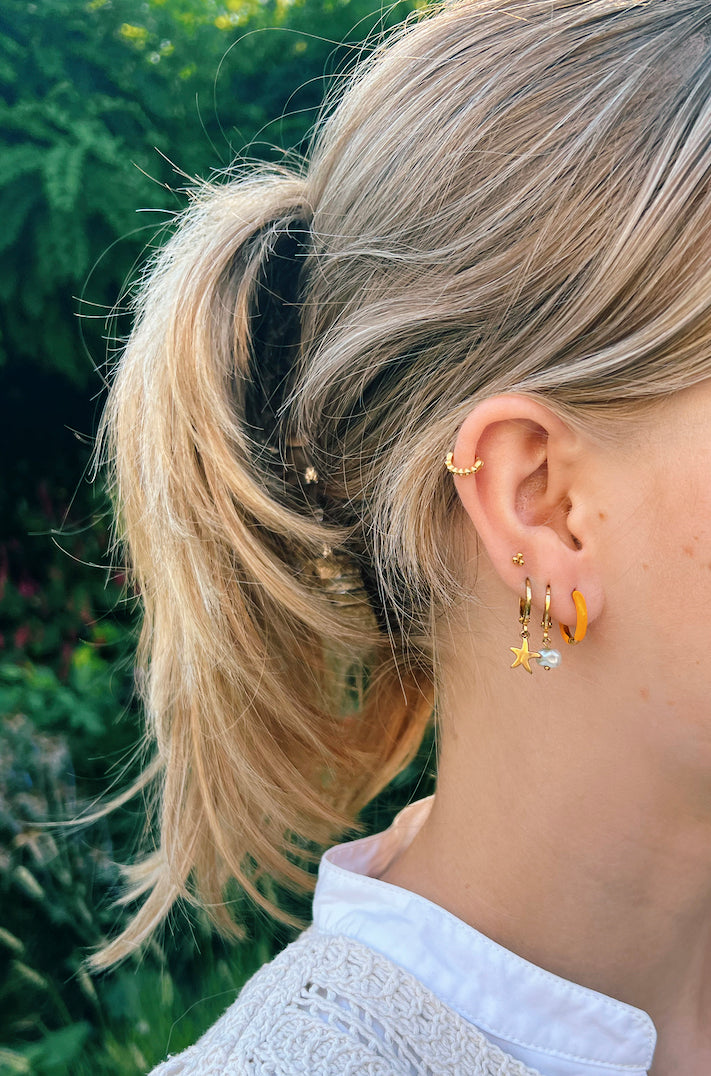 Deze kleine oorbellen in de kleur goud met oranje vrolijken jouw hele earparty op! Draag de oorringen alleen voor een statement of combineer ze met andere gouden oorringen en oorstuds.
