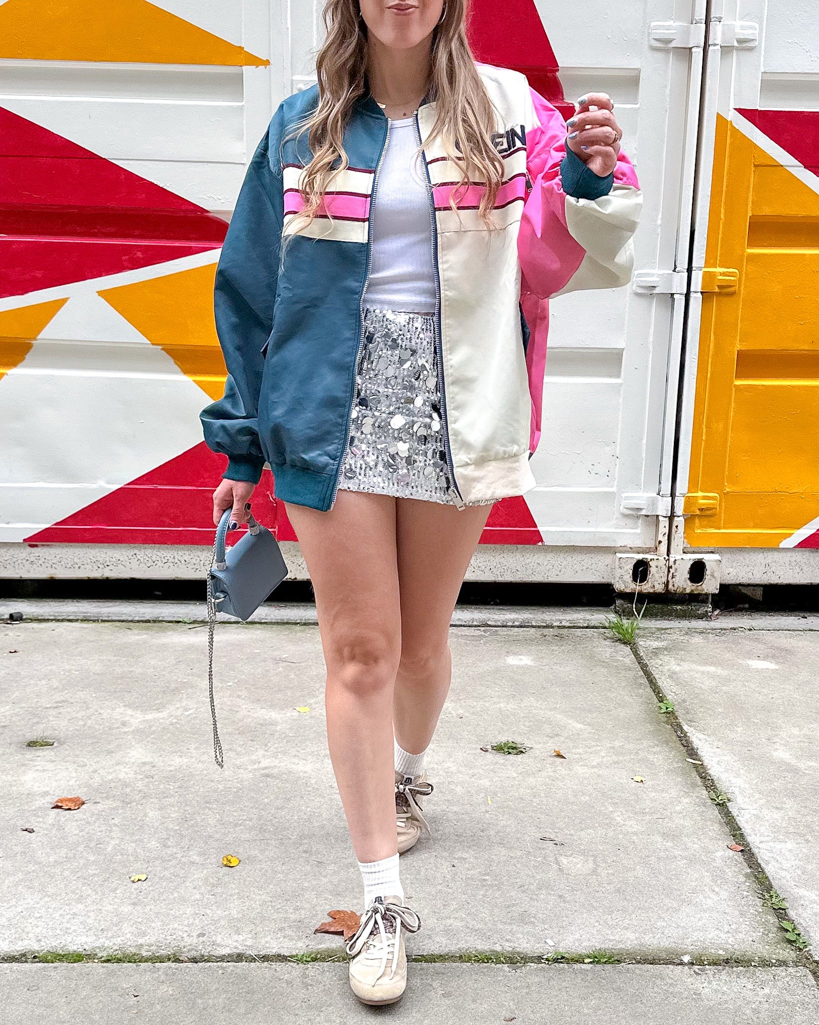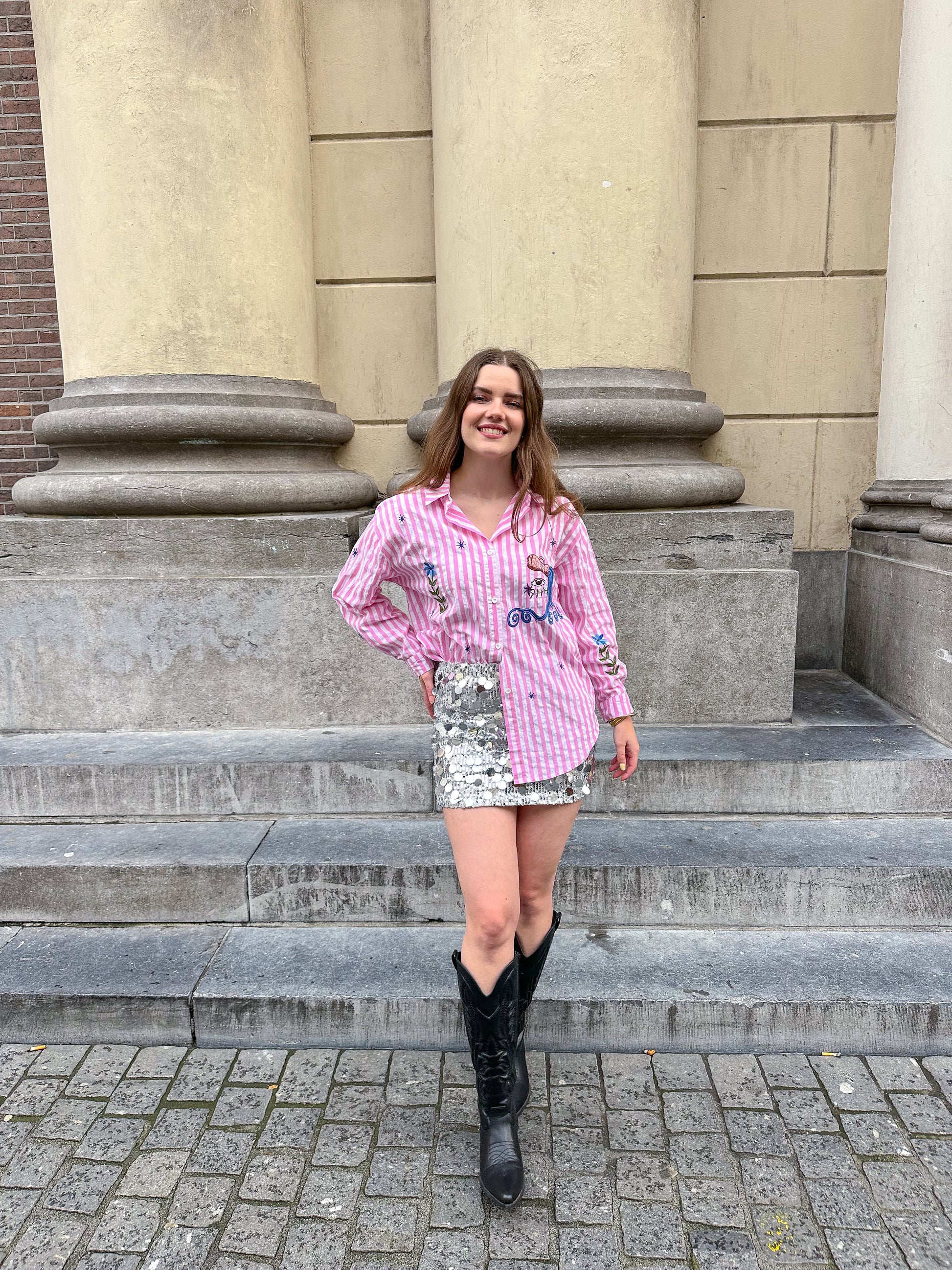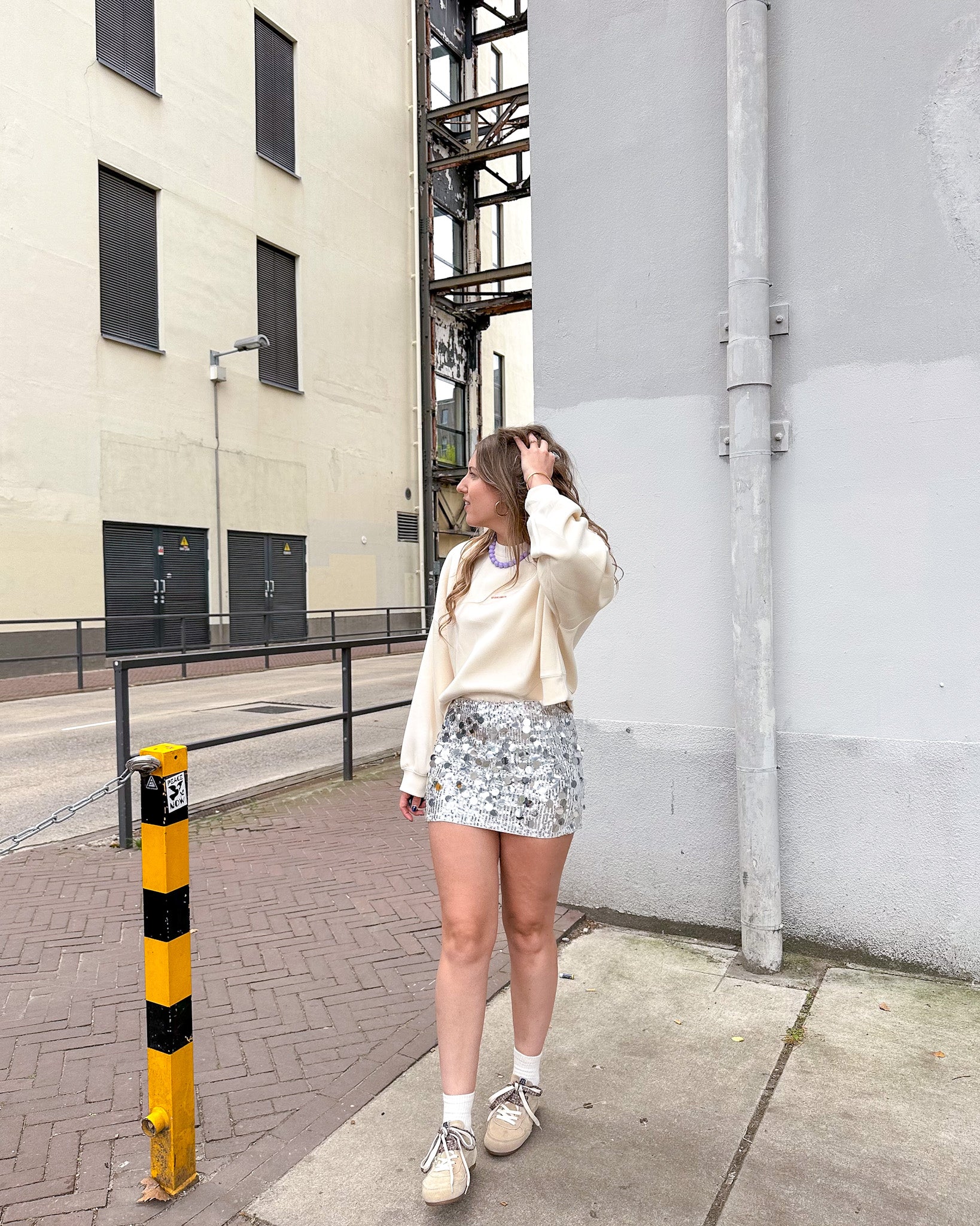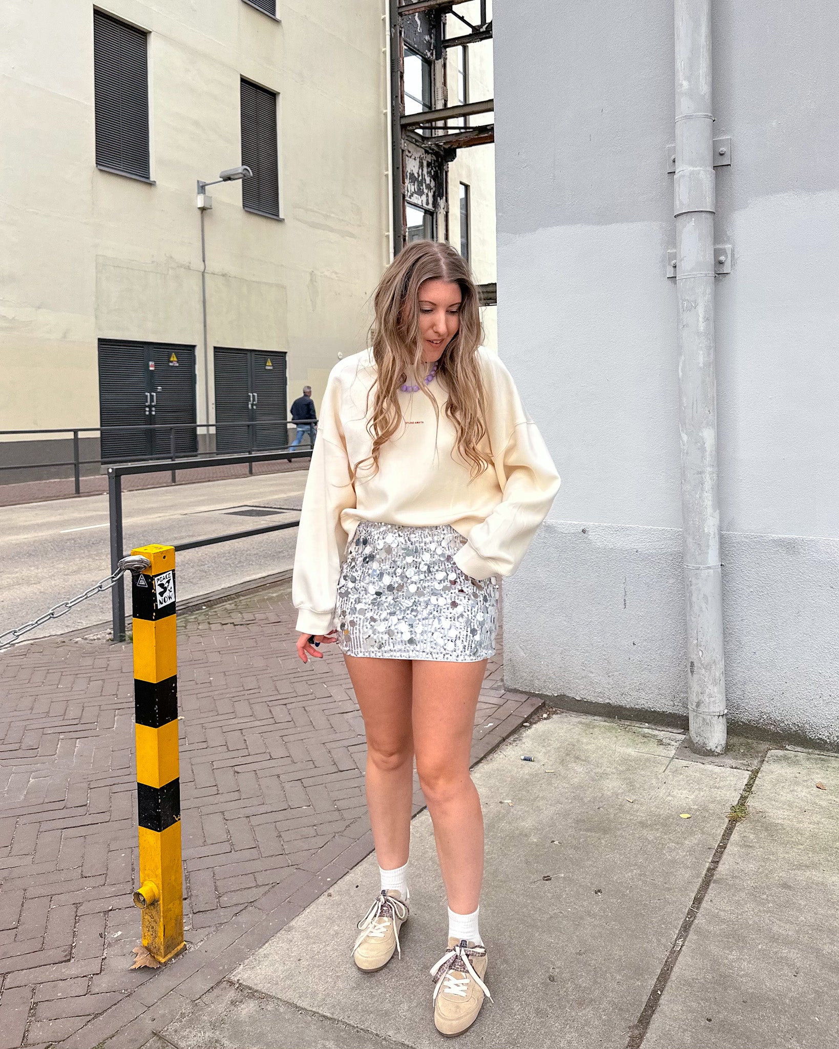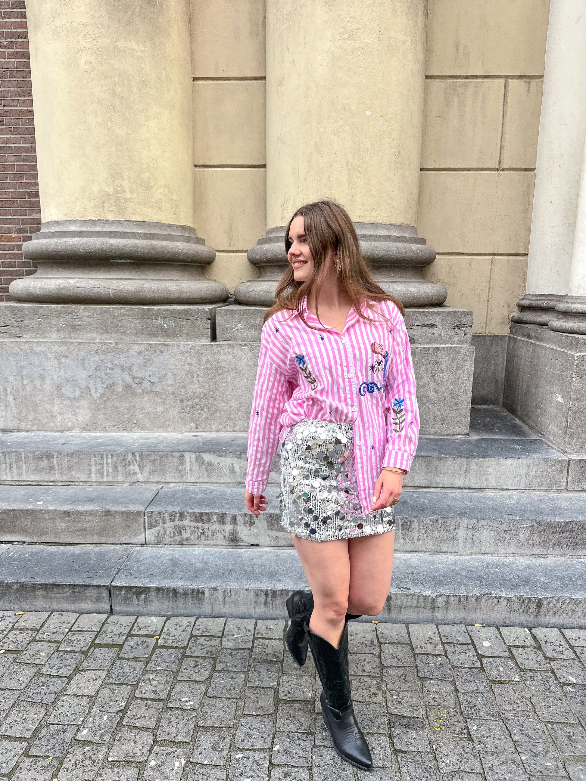 Kort glitter rokje met grote en kleine pailletten. Er zit stretch in voor extra comfort. De zilveren kleur is makkelijk te combineren om er een feestelijke outfit van te maken.