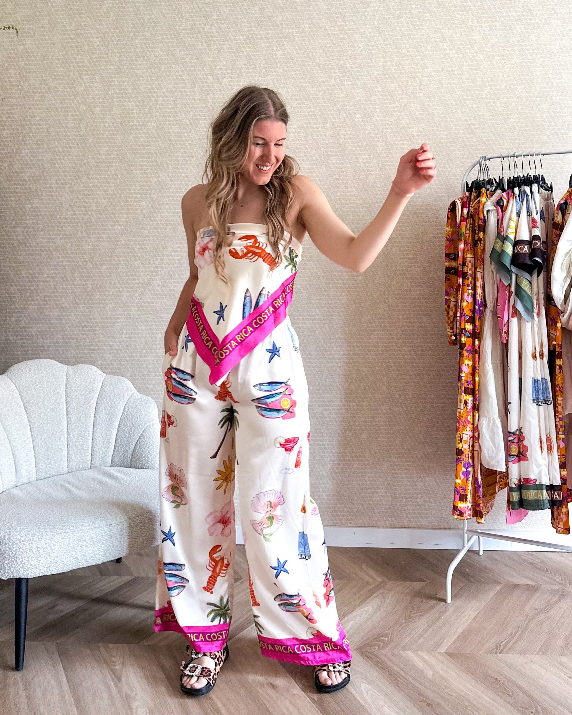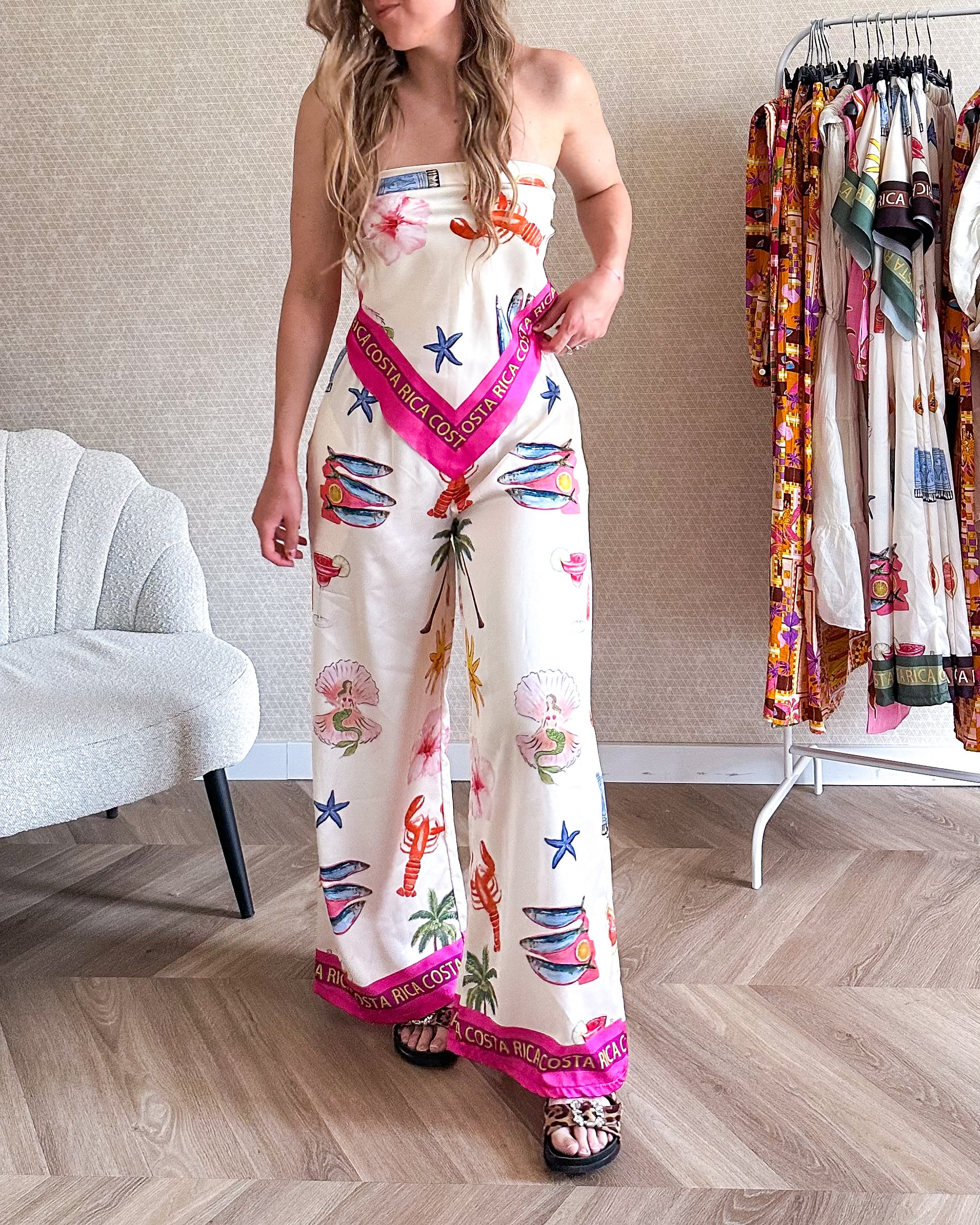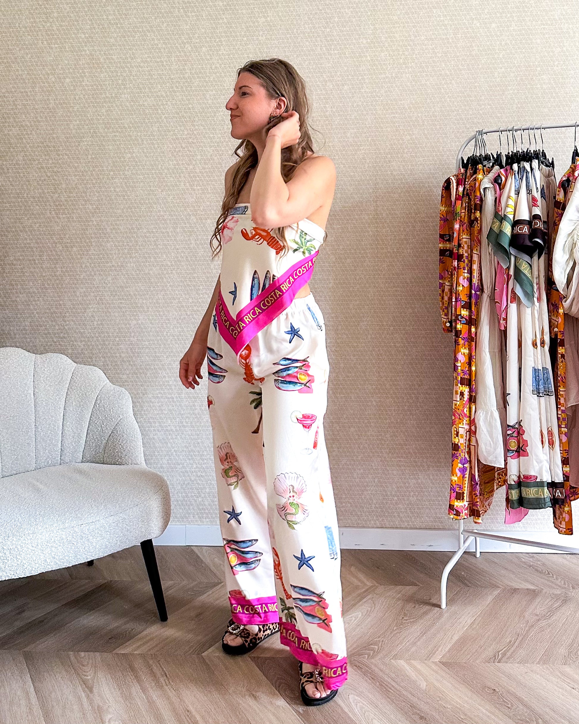 Luchtige set bestaande uit een broek en een sjaaltje. De set heeft een zomerse print bestaande uit onder andere kreeften, vissen en palmbomen. Met roze streep details. De broek heeft een wide leg fit. En het sjaaltje is makkelijk te dragen als top, maar ook heel leuk als sjaaltje om de nek, hoofd of aan je tas.