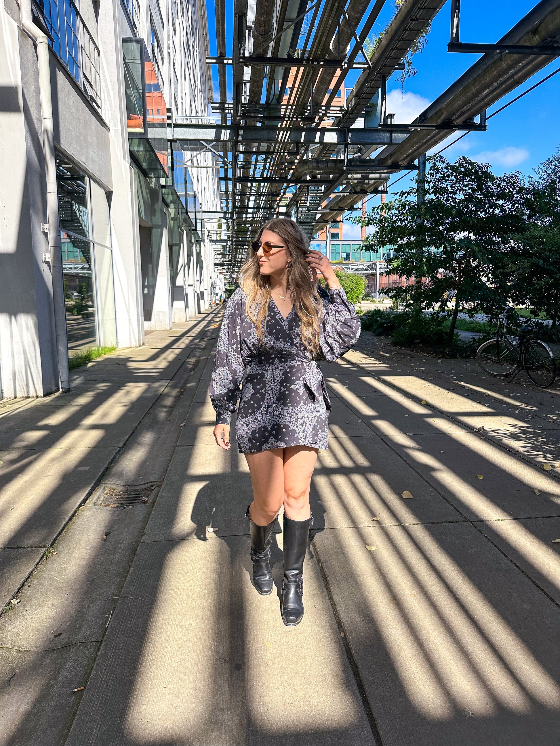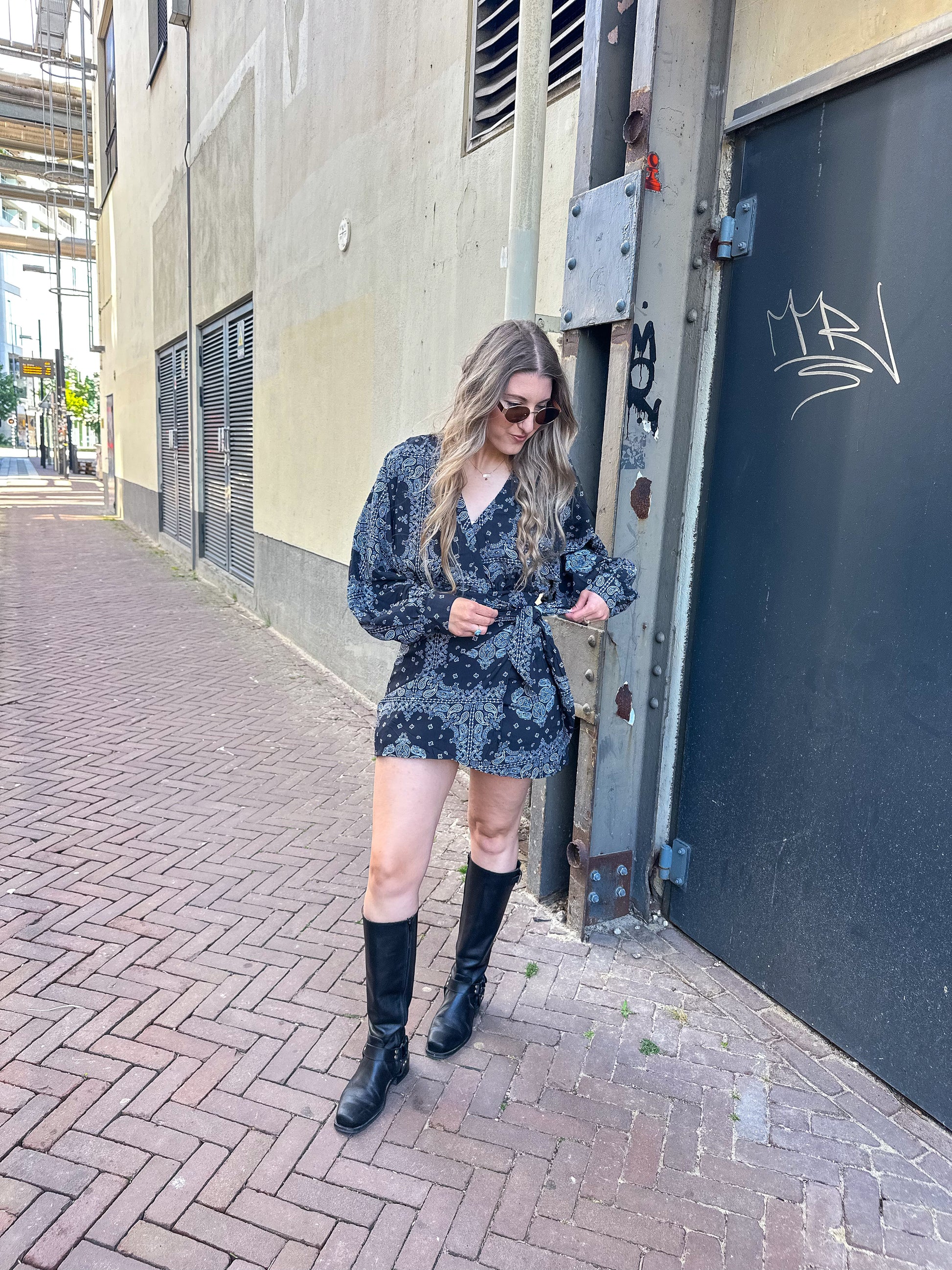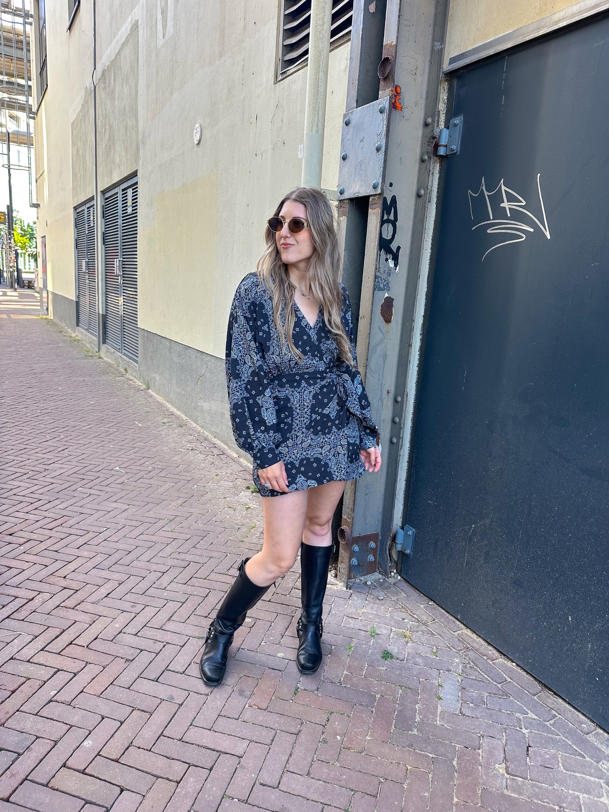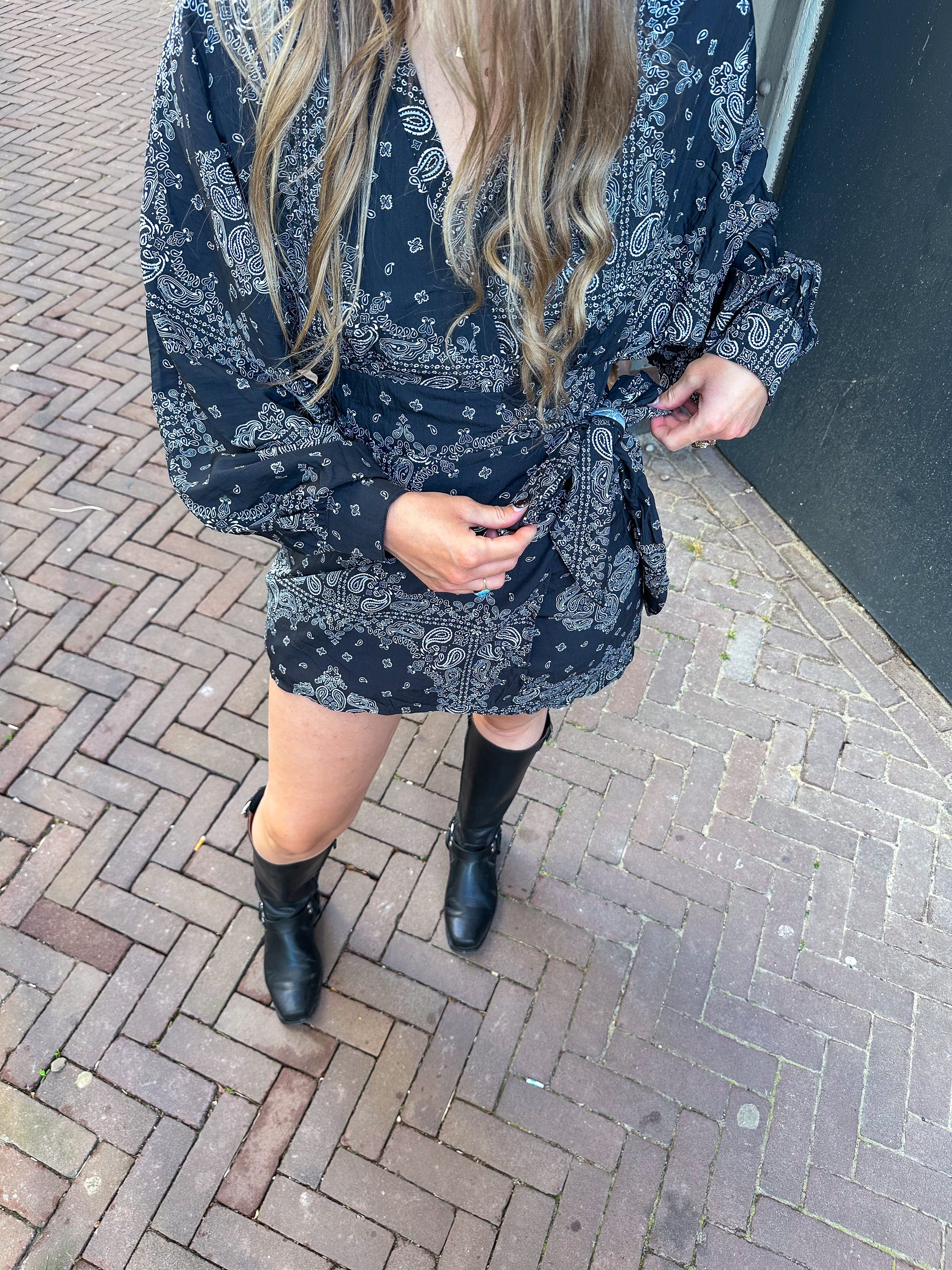 Paisley print jurkje in de kleur zwart. Dit overslag jurkje heeft 3 strikken waardoor deze niet snel open waait. De zwarte bandana sjaaltjes print maakt het jurkje stoer en on trend. Het jurkje is perfect voor festivals, terrasjes of casual voor iedere dag.