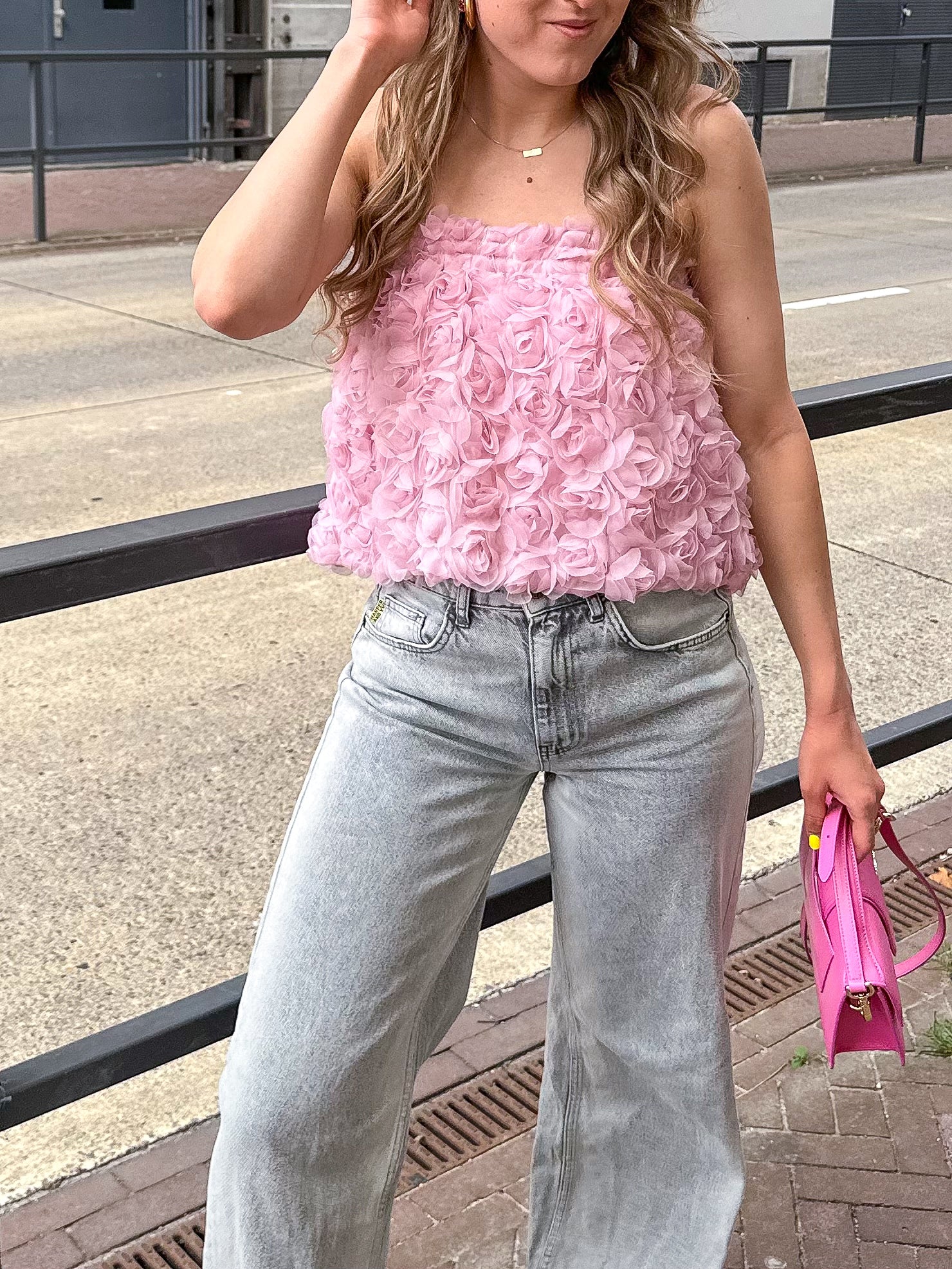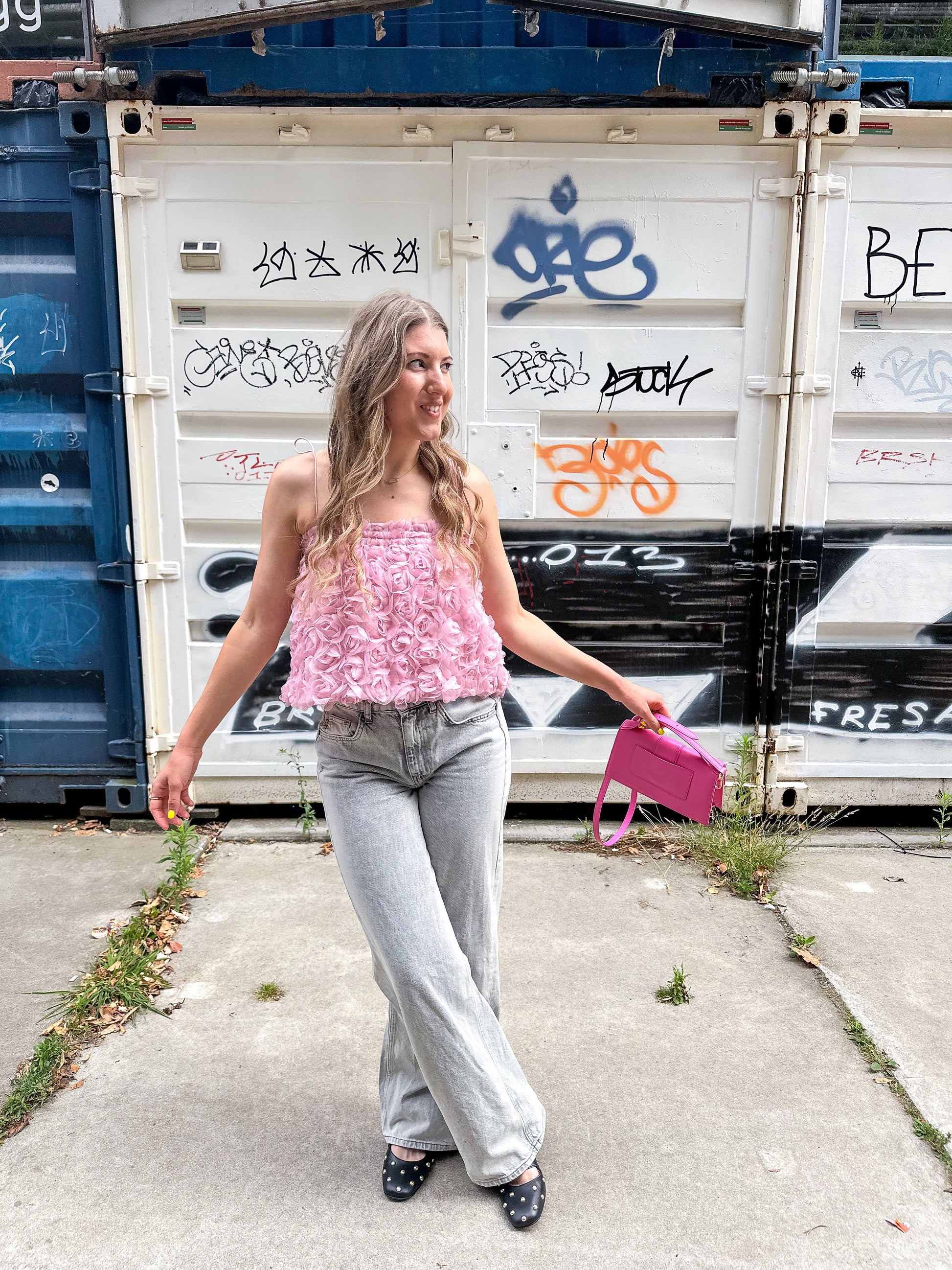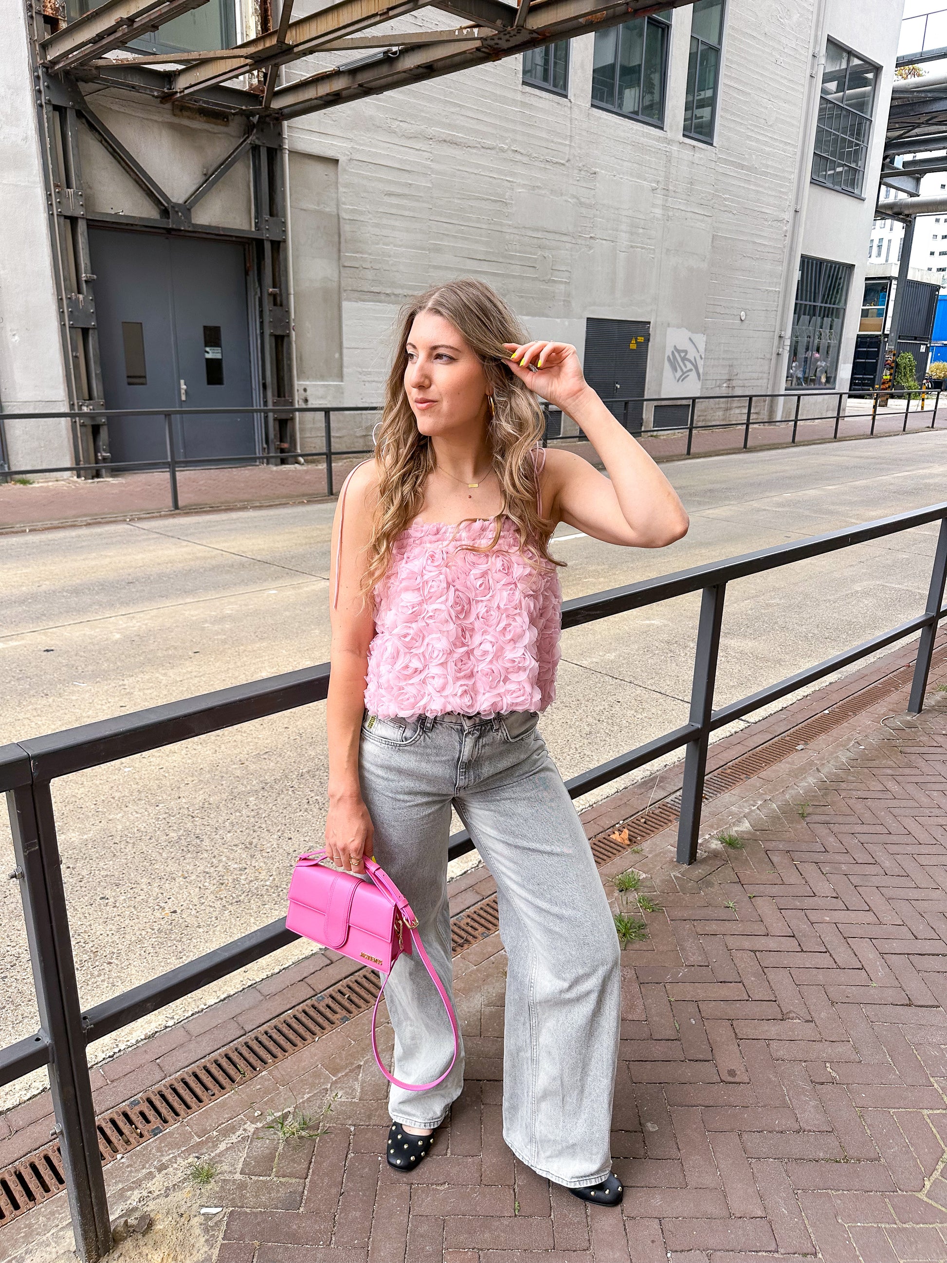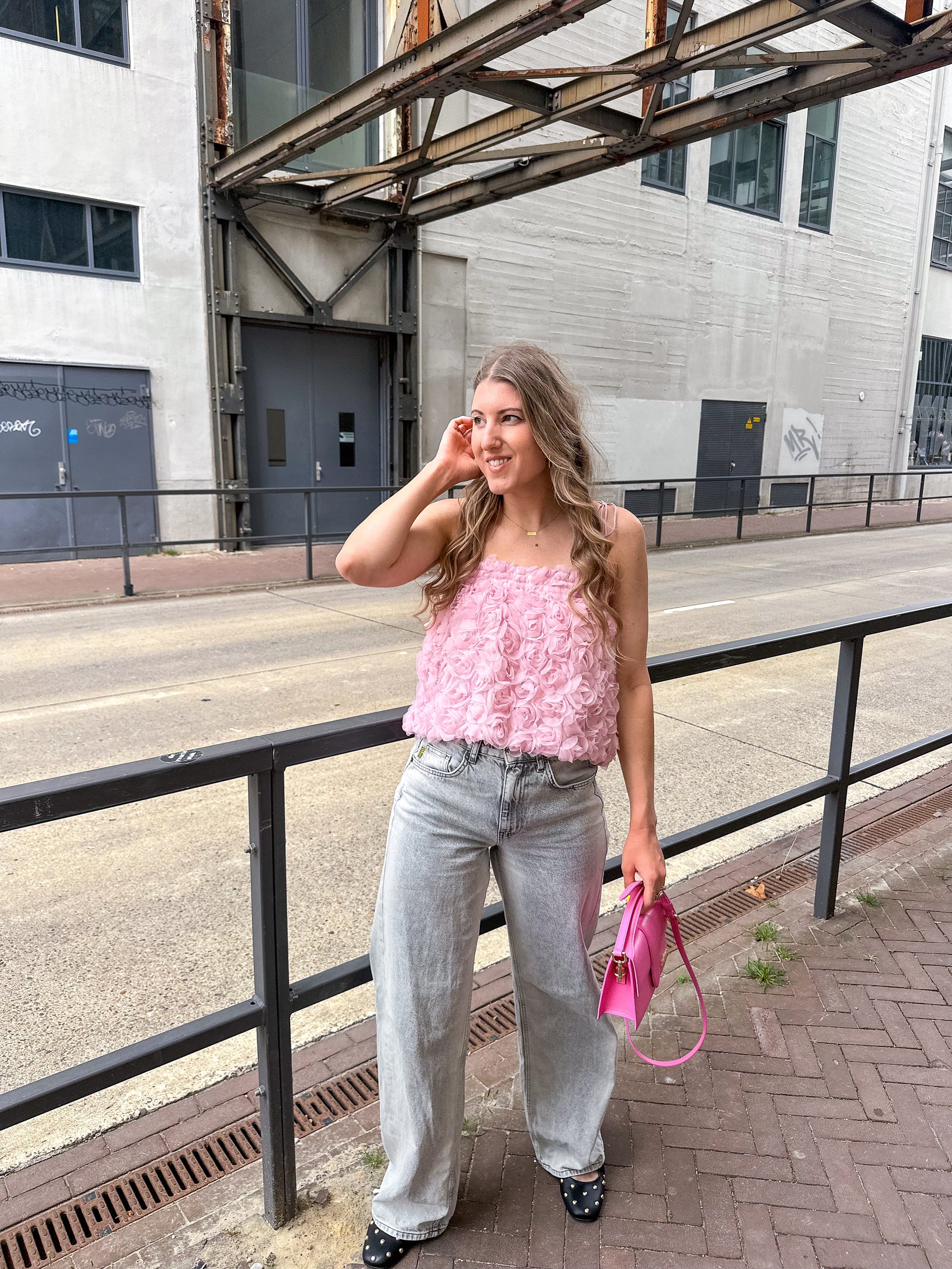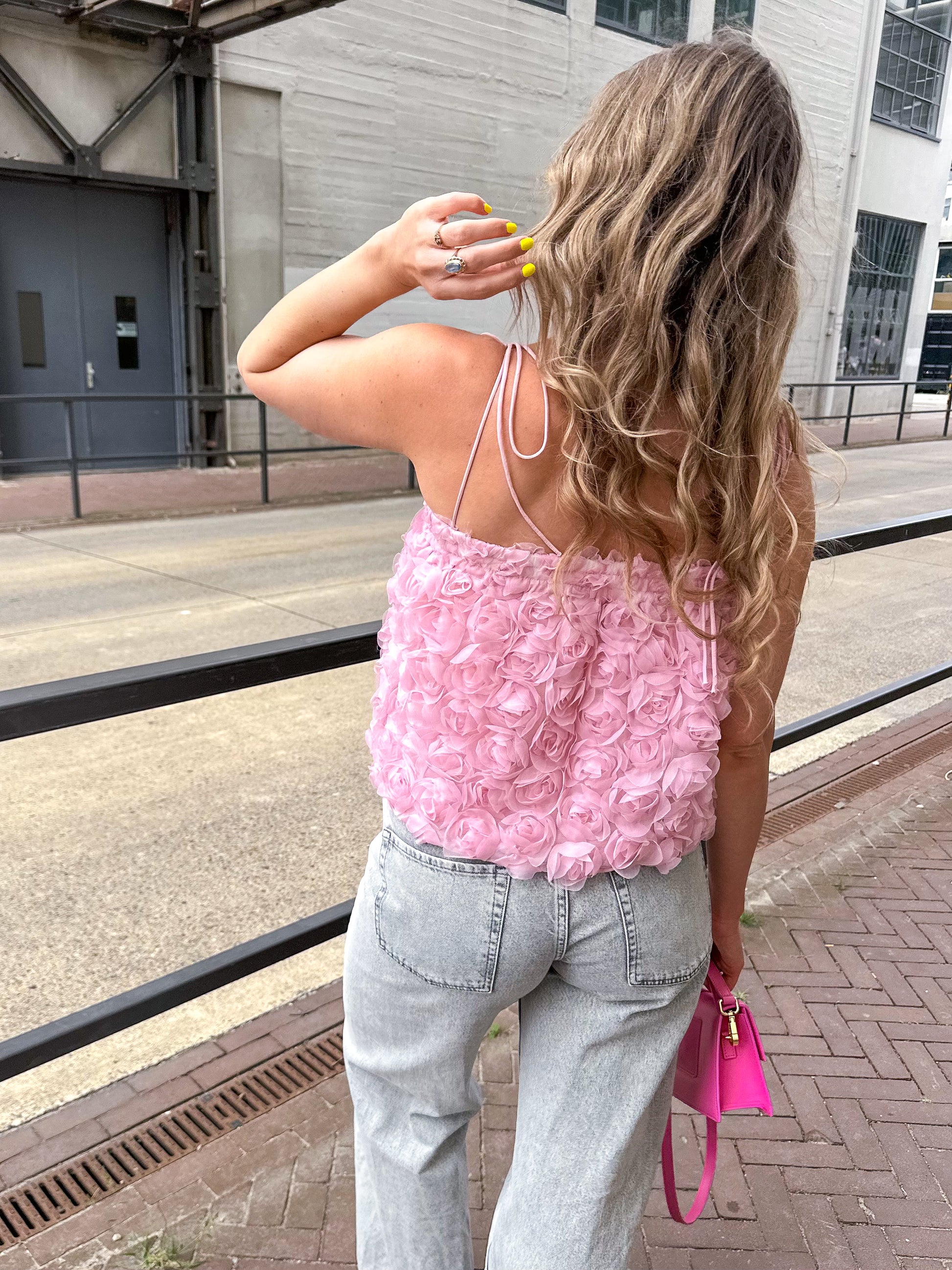 Crop top met spaghetti bandjes en een 3D rozen patroon. De a-line fit geeft de top een stoere uitstraling. Maar de roze kleur geeft de top een romantisch tintje. Een eye catcher top voor je party outfit of casual te stijlen met een jeans.