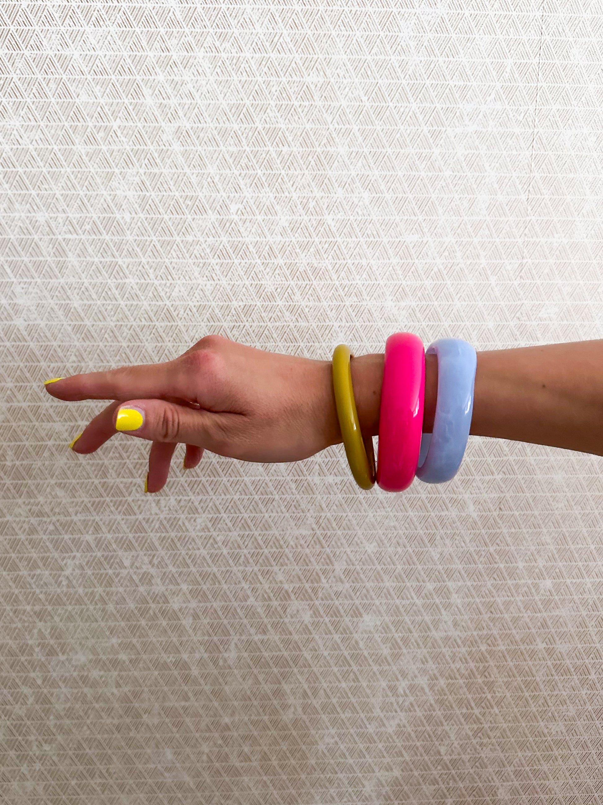 Chunky bangle armbanden zijn terug van weggeweest. Maak een statement met deze leuke set van 3 armbanden in geel, roze en lila. Deze cuffarmbanden zijn gemaakt van resin.