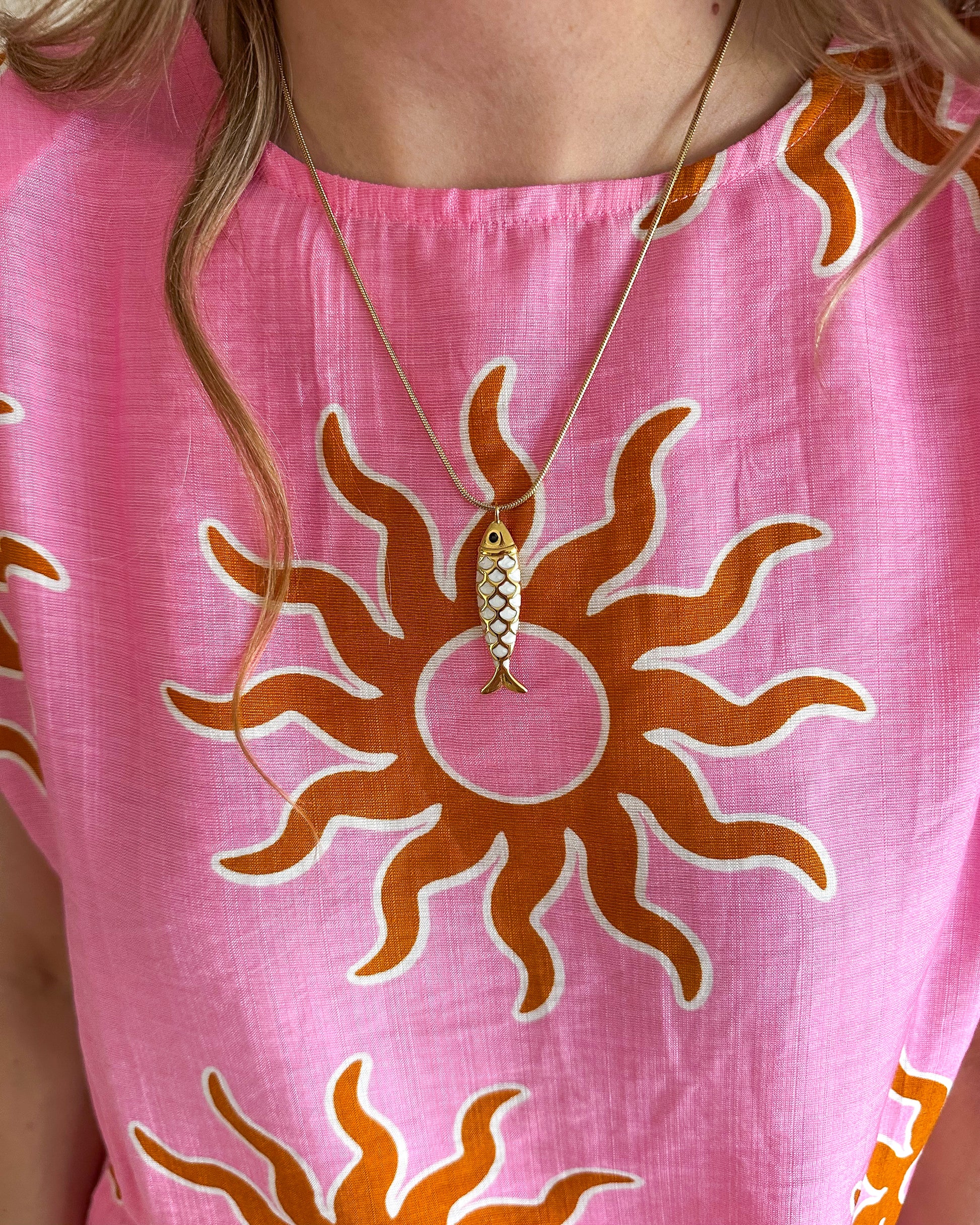 Goudkleurige ketting met visje. Het visje heeft witte schubben welke worden gescheiden door een gouden omlijning. Hierdoor heeft het een mooie gedetailleerde uitstraling.