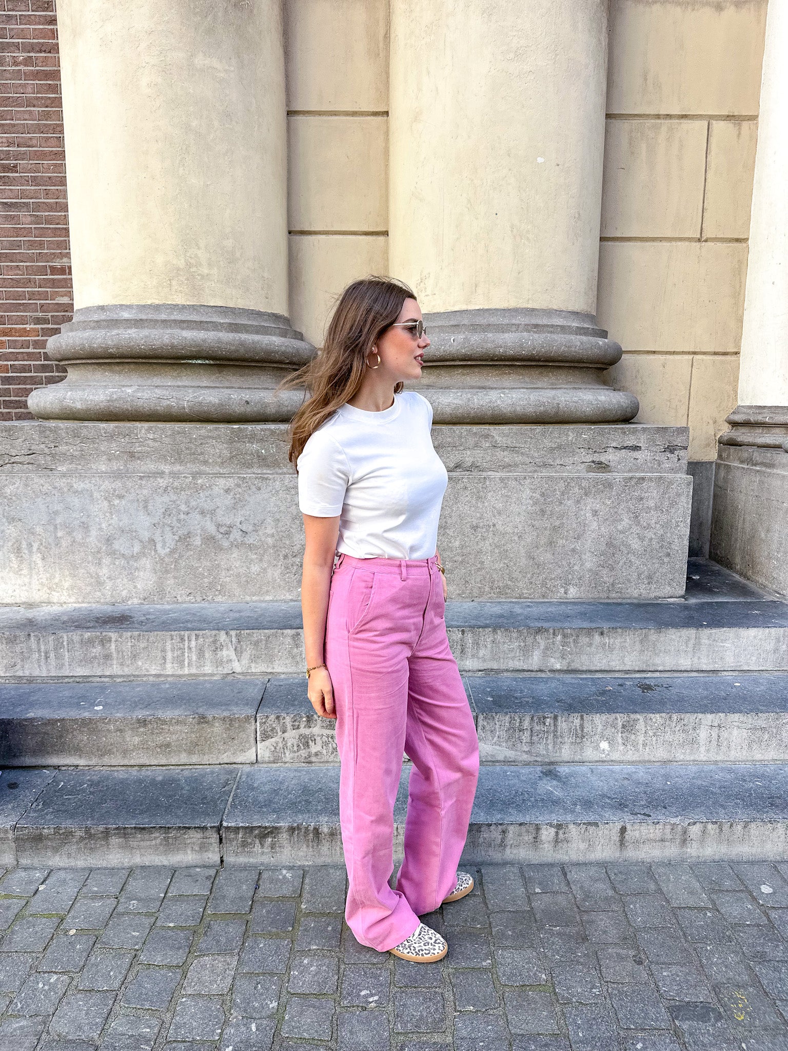 Deze roze denim broek vrolijkt meteen je kast op dit najaar! De broek is gemaakt van een fijne zachte denim stof zonder stretch. De broek loopt een klein beetje wijd uit naar onder. De jeans is mid waist. Draag samen met een comfy sweater of met de bijpassende Jule jacket. Deze broek is van het mooie merk Studio Amaya Amsterdam.