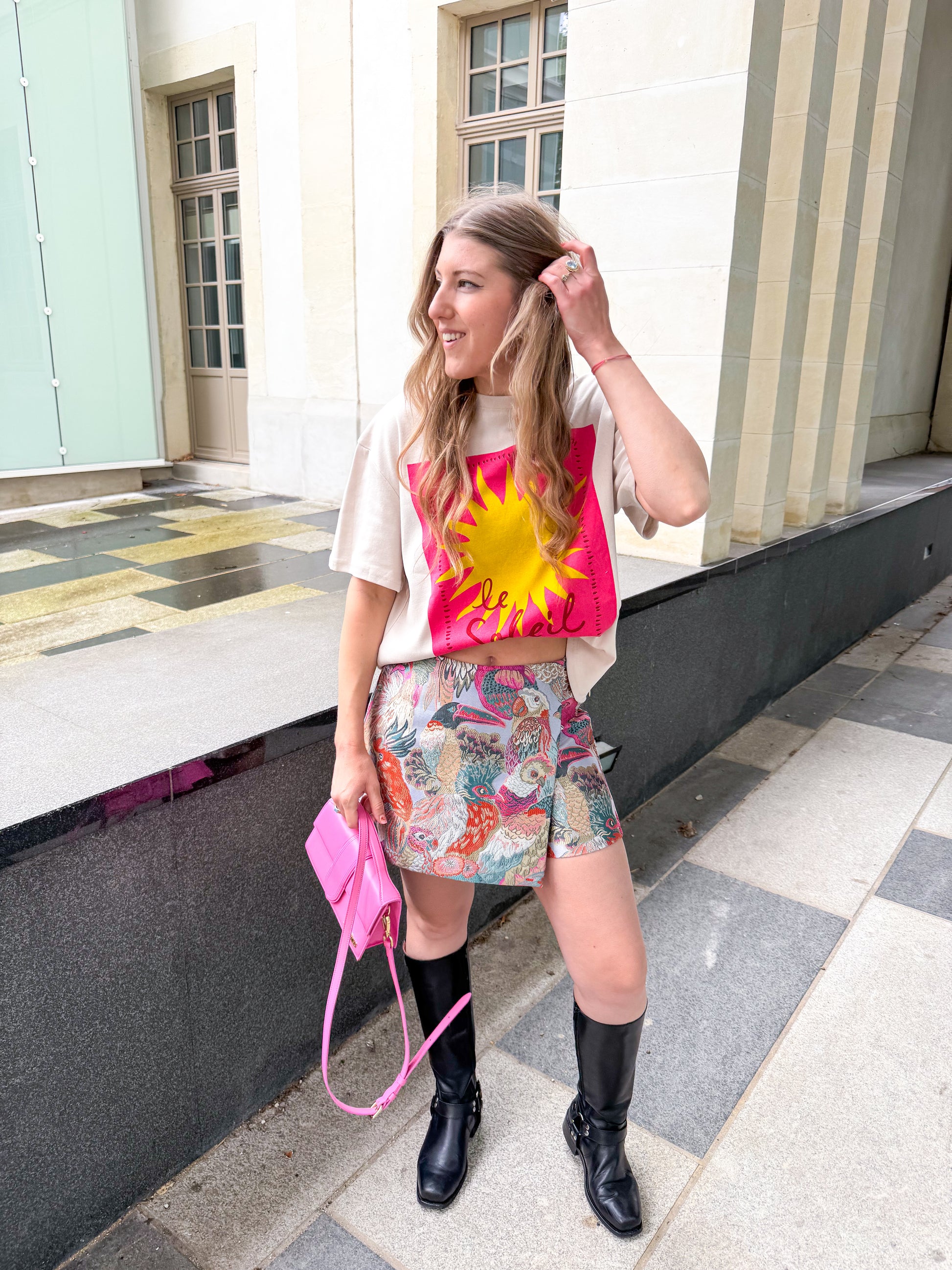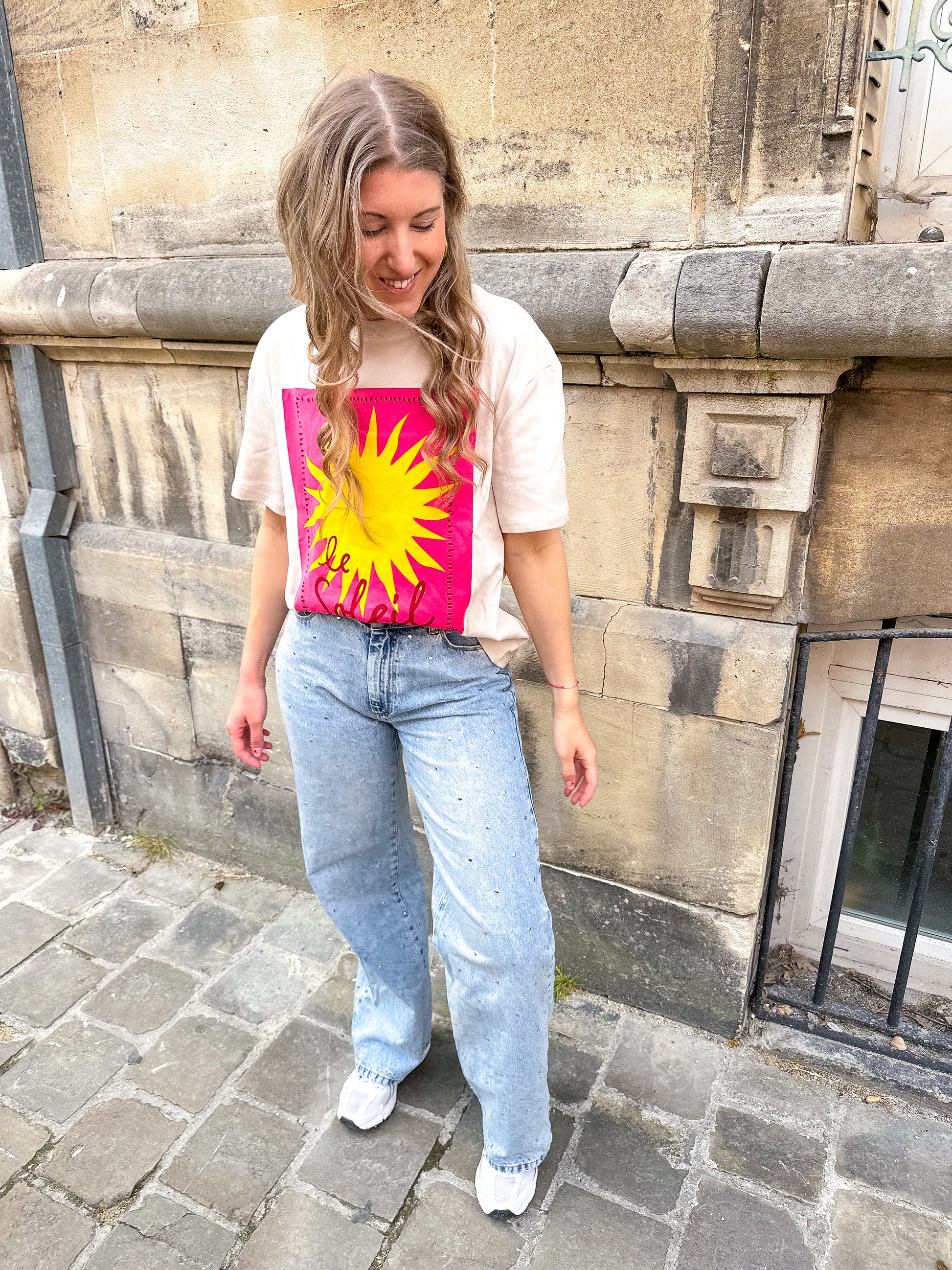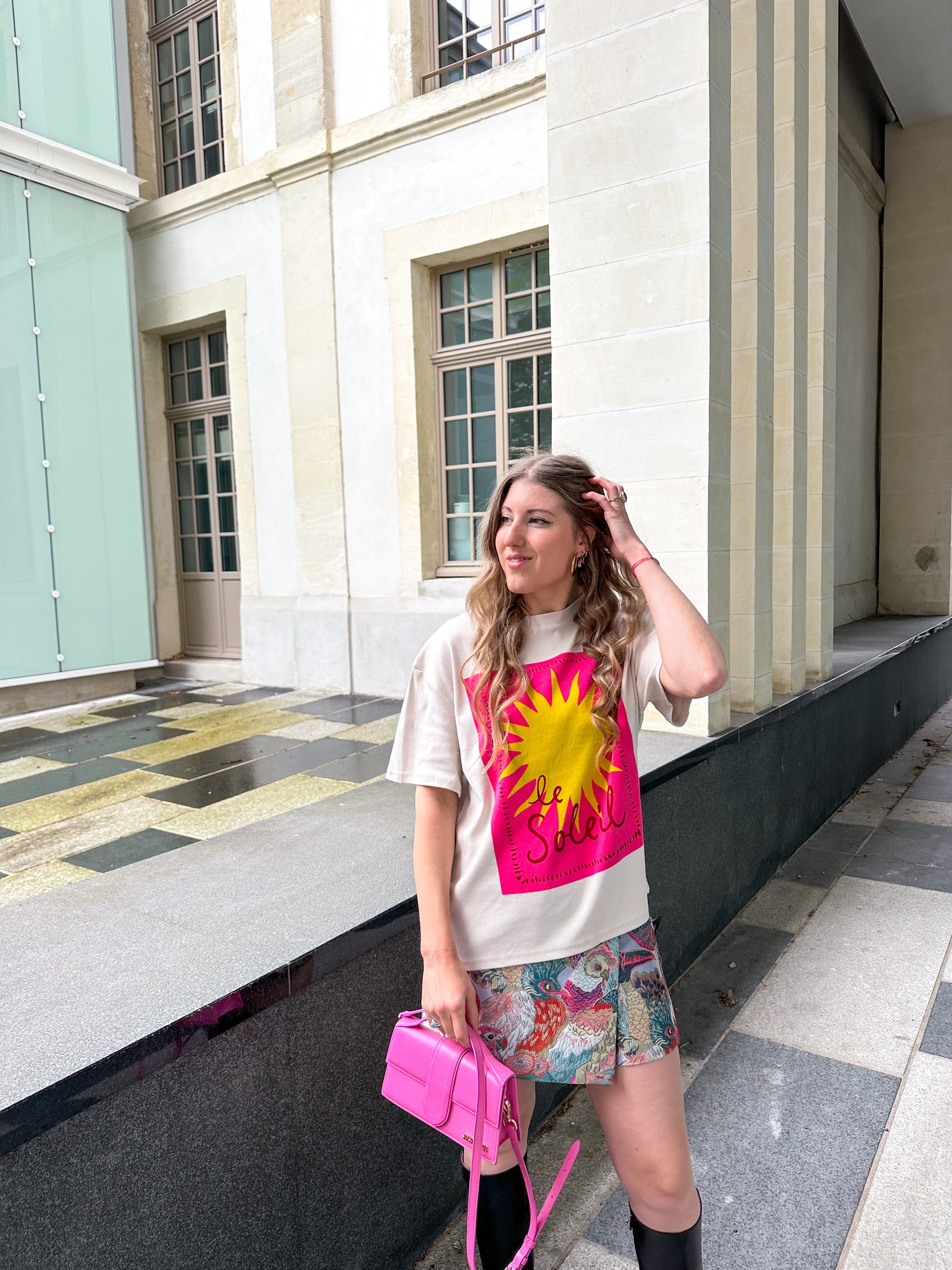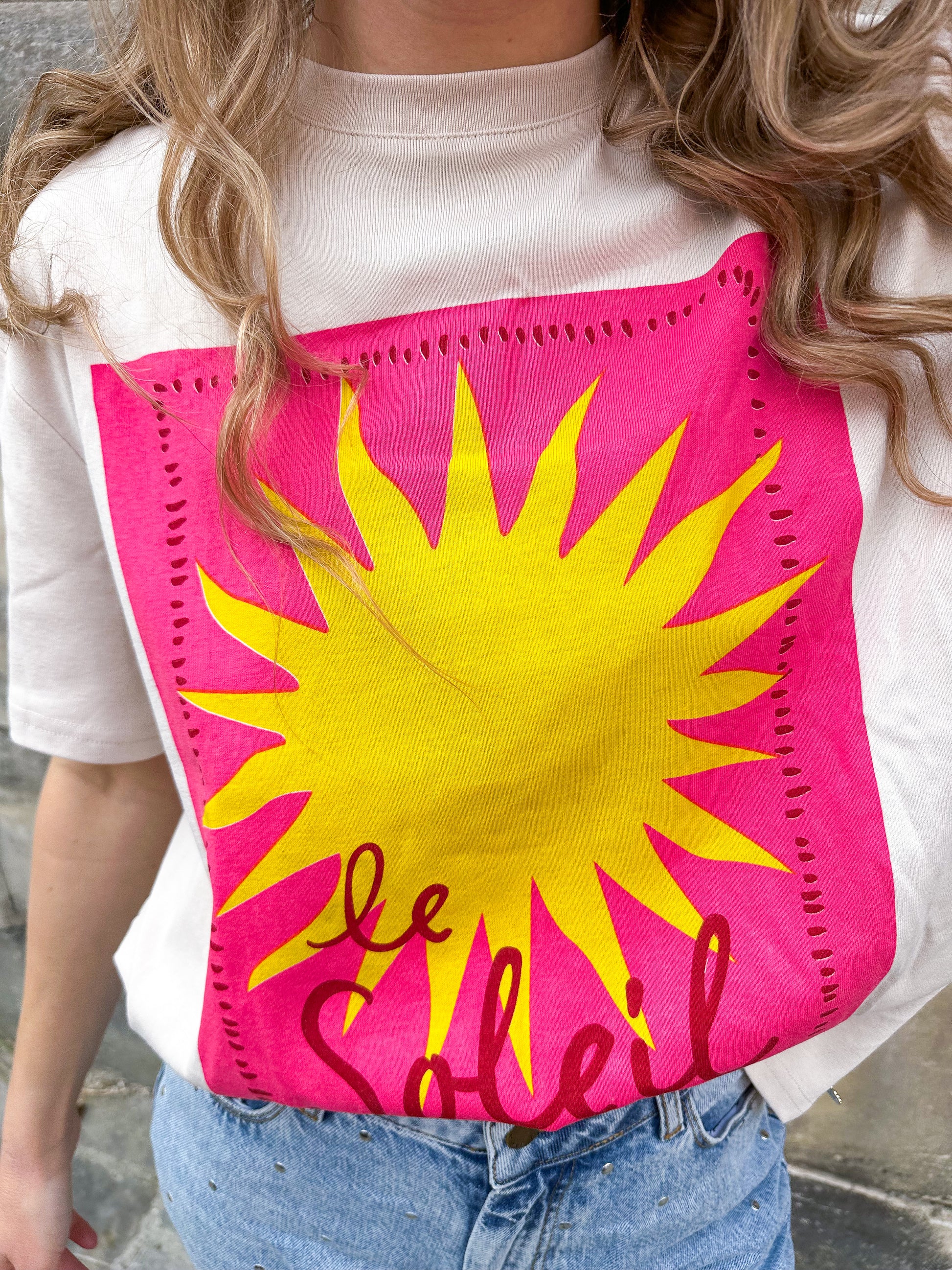 Dit IT shirt heeft de perfecte taupe kleur en een vrolijke roze met gele opdruk.