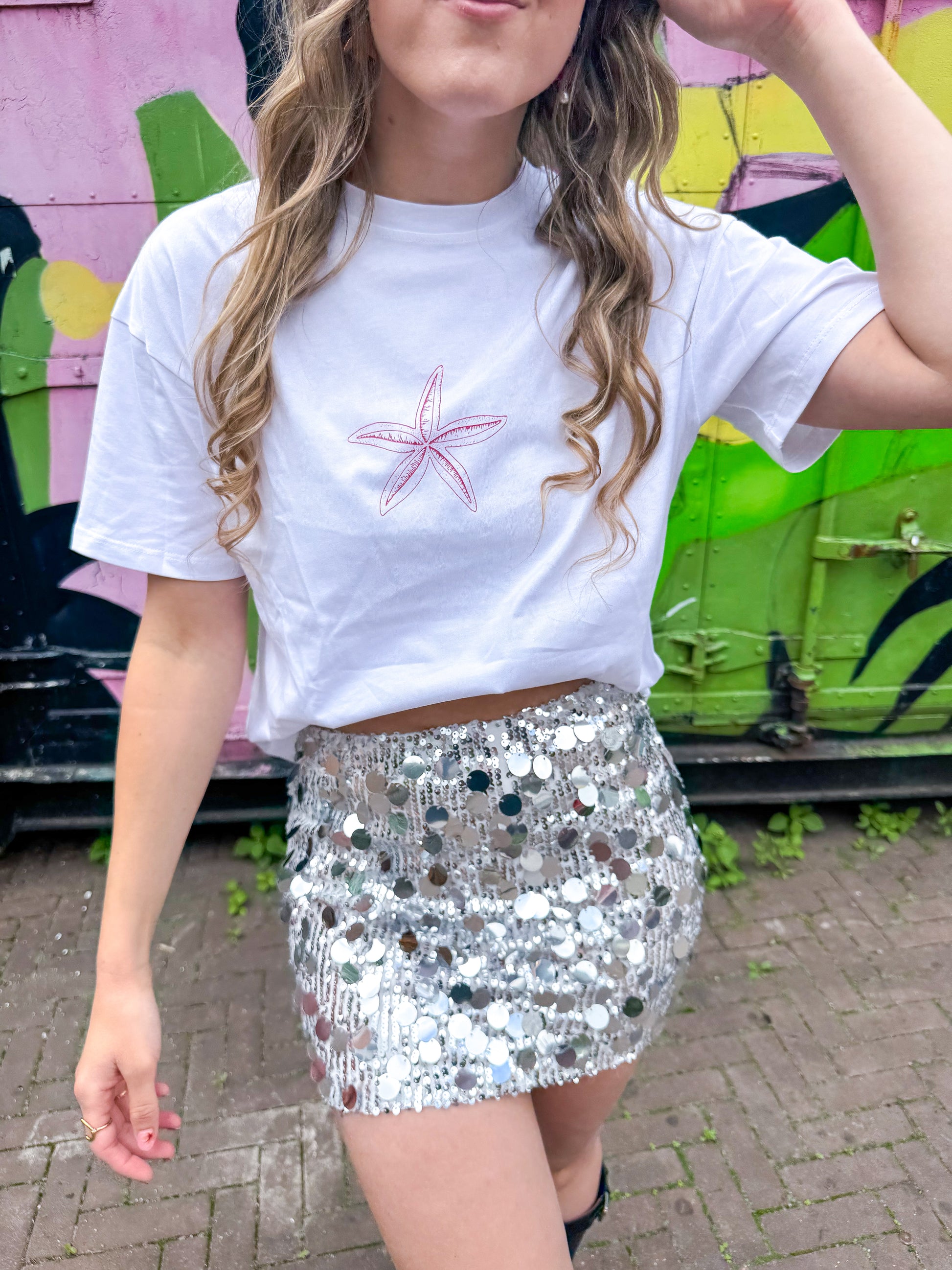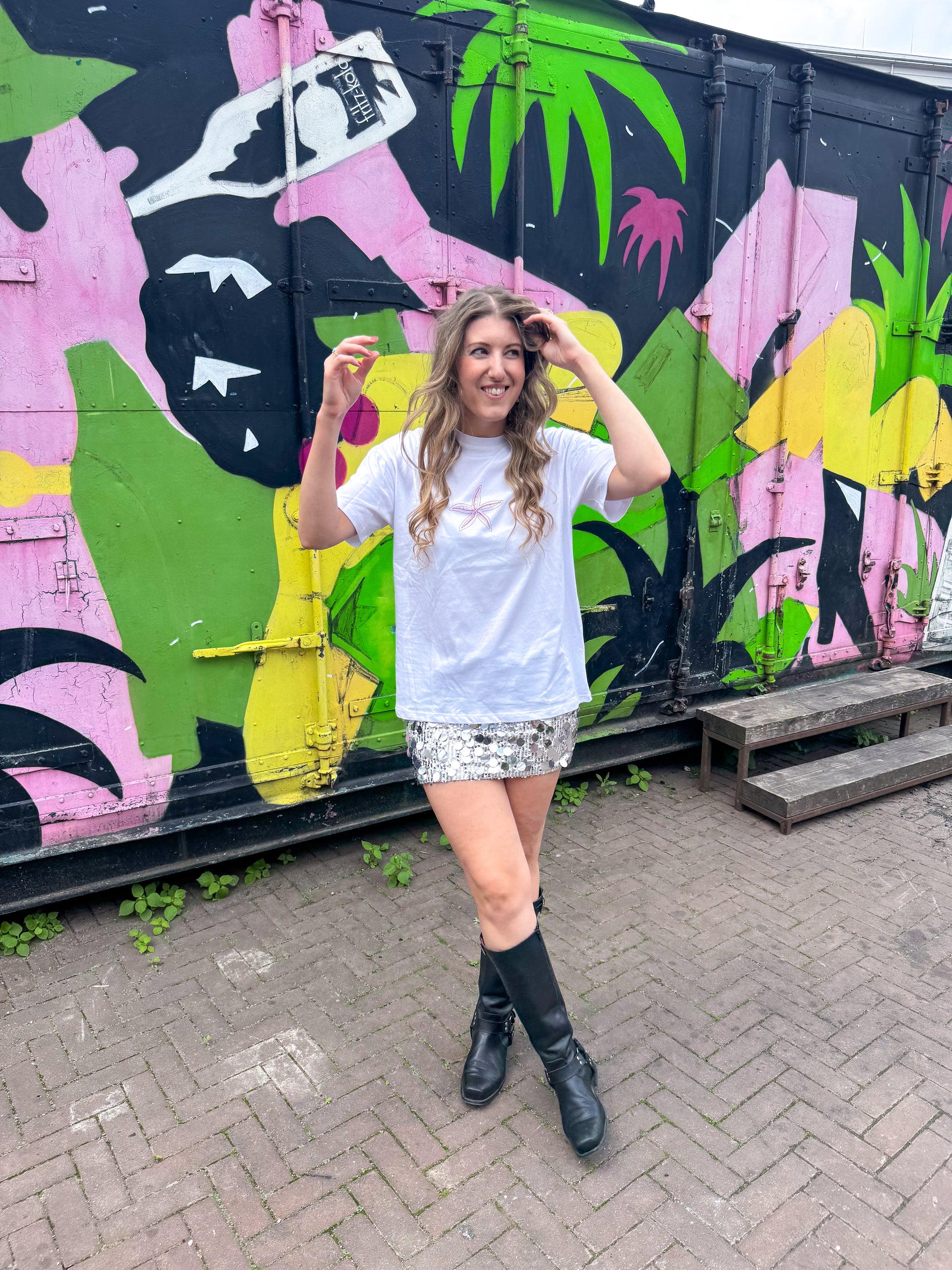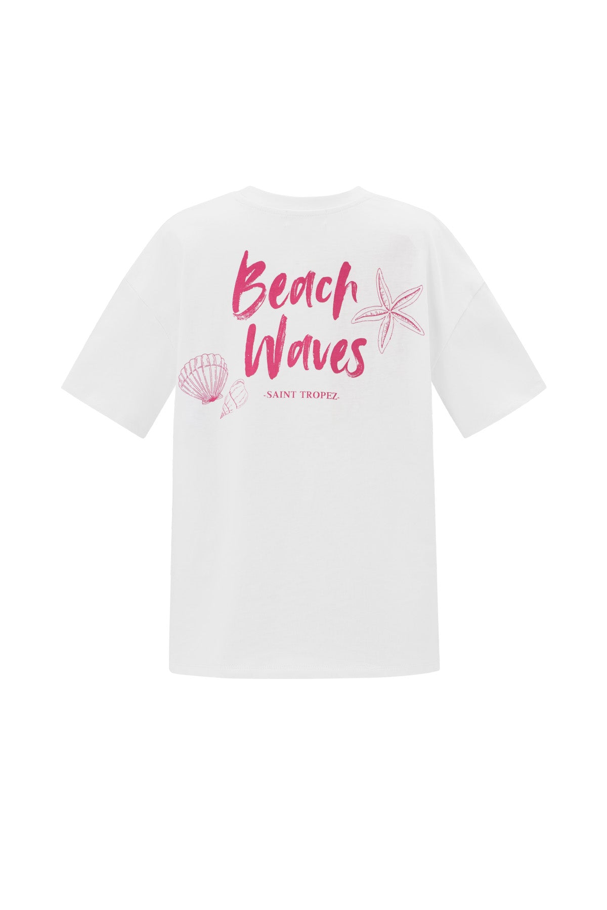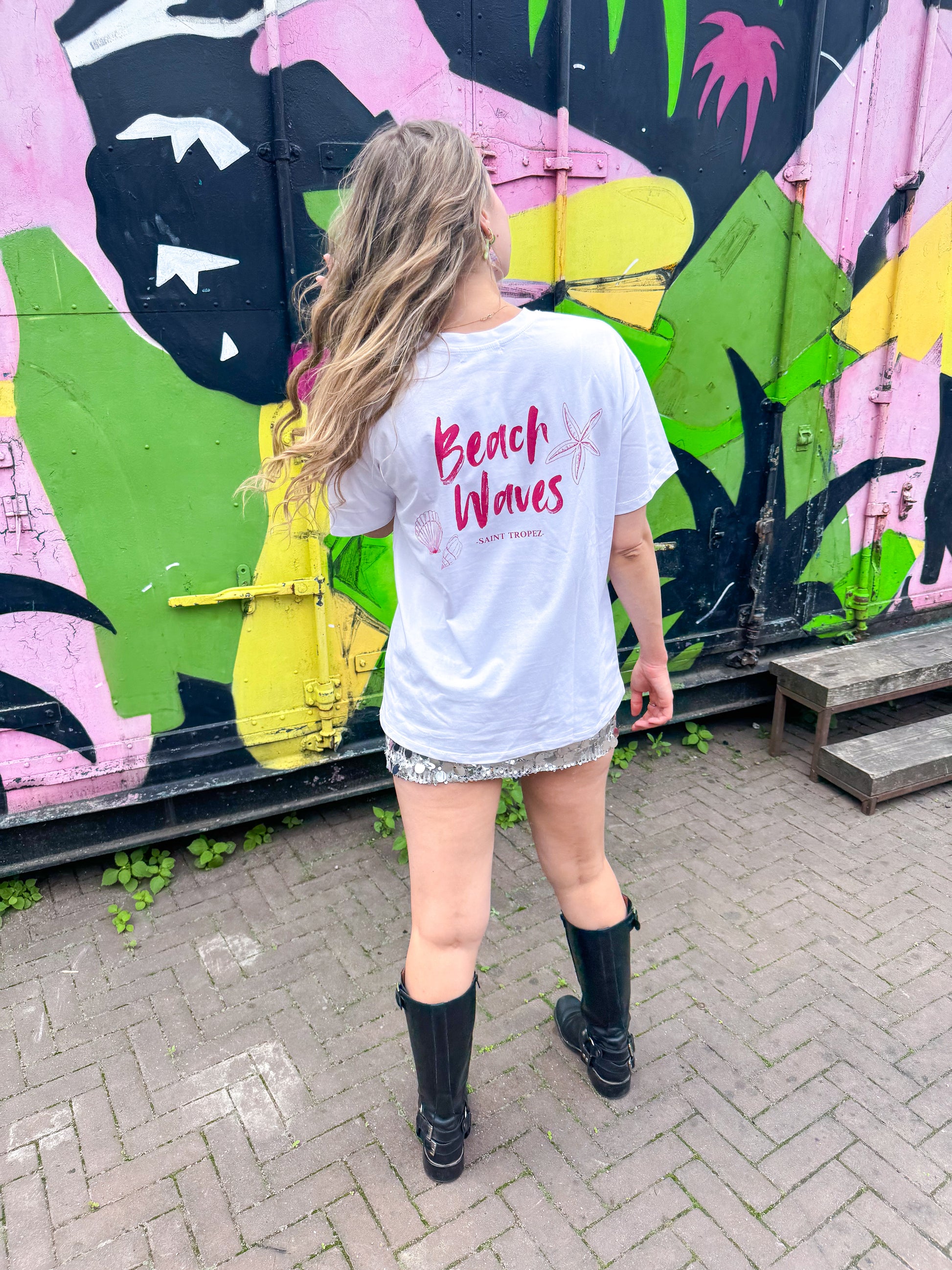 Het perfecte it t-shirt voor deze zomer! Dit witte t-shirt heeft een toffe zeester print op de voorkant in de kleur roze. Op de achterkant is een staat in het groot beach waves saint tropez met een zeester en schelpen. Leuk te stylen op een rokje of short, maar ook perfect op een jeans.