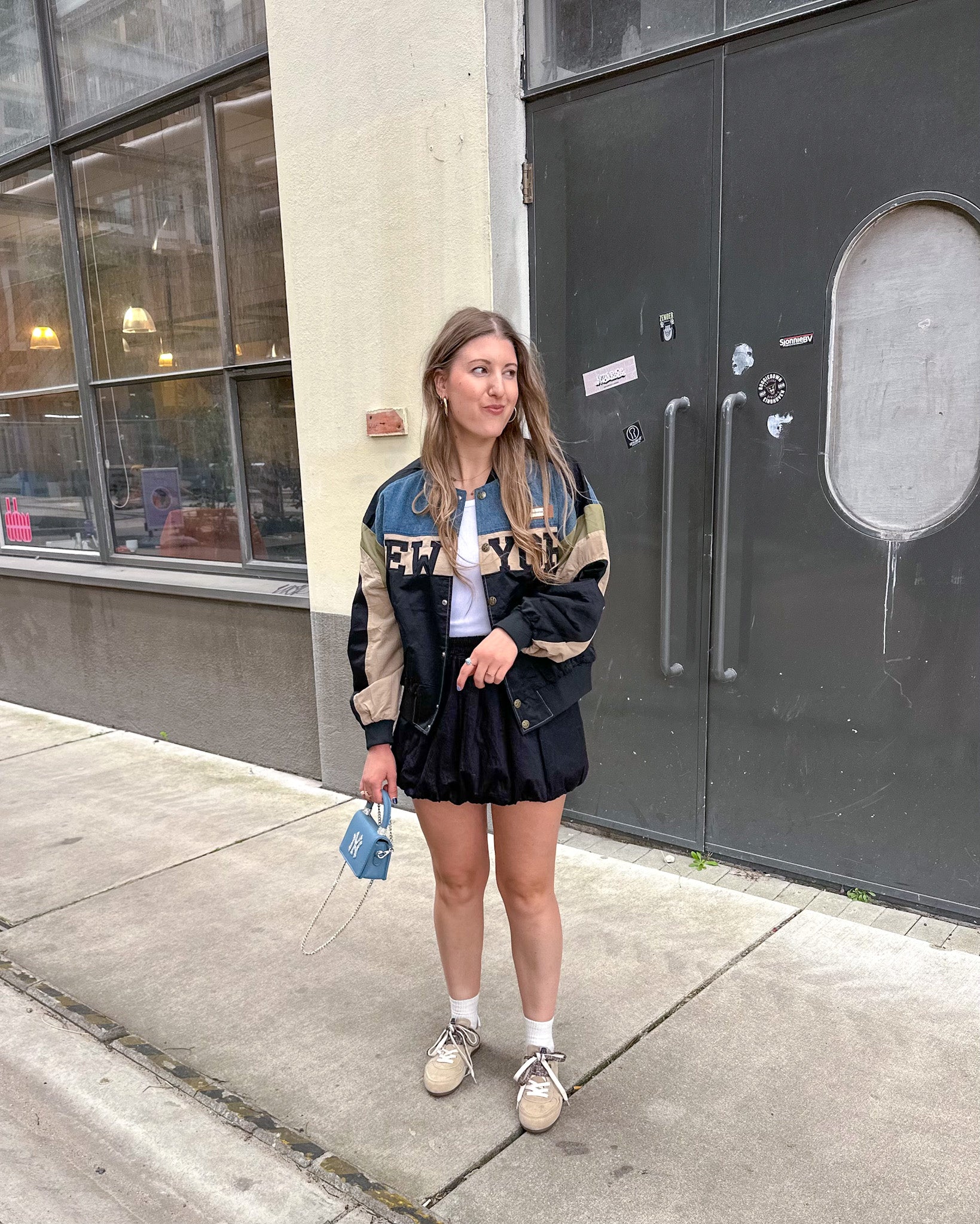 Varsity bomber jacket met de tekst New York op de voorkant. Het bomber jasje is een statement piece en een stoere uitstraling dankzij de denim stof en bruine, groene en zwarte details. Cropped fit en bronzen drukknopen. Deze jacket valt oversized. Ideaal als tussenjasje te gebruiken of maak er een every day look van met je favoriete jeans eronder.
