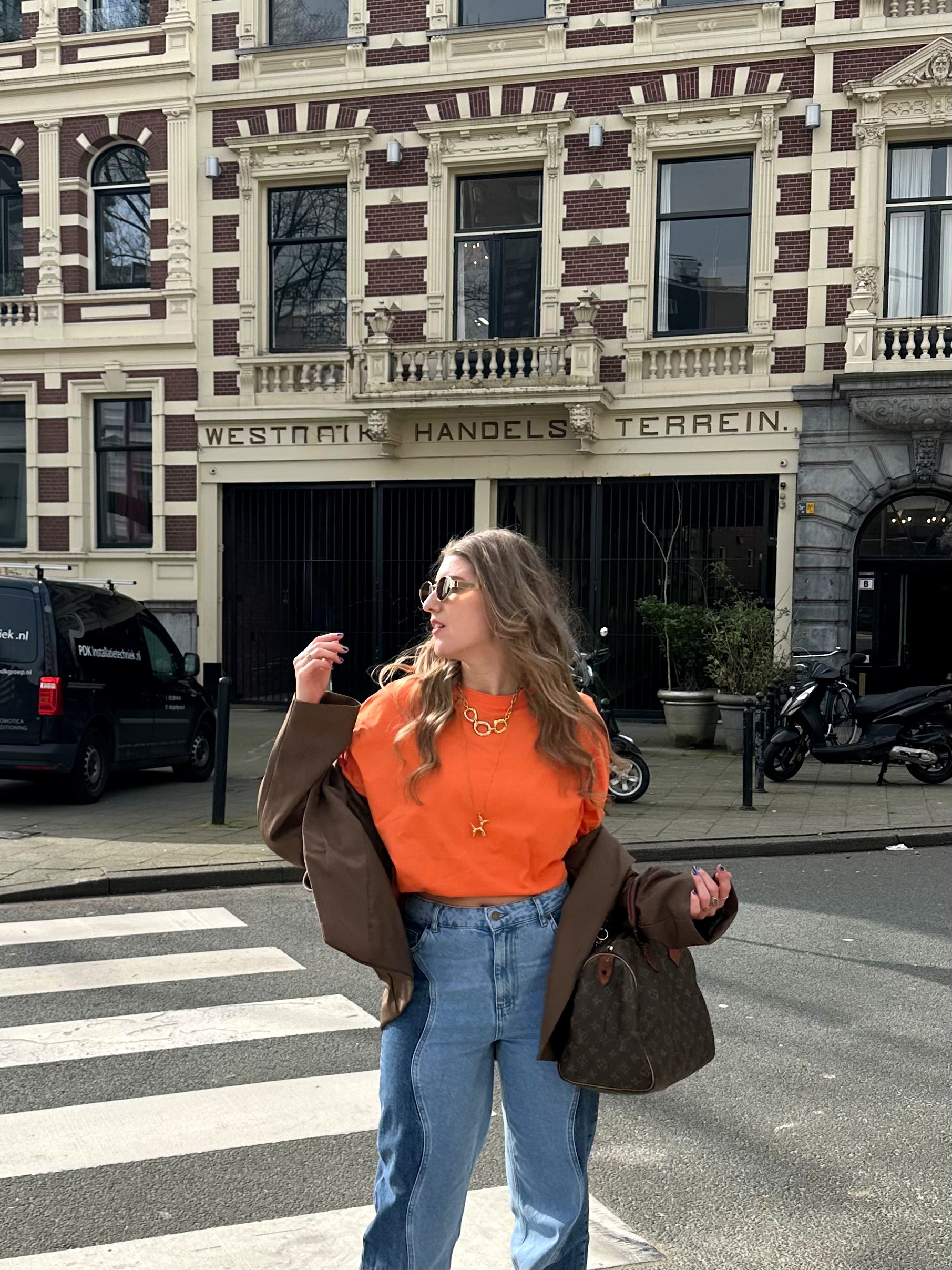Dit oranje t-shirt heeft een toffe backprint met de tekst: Amour. Het shirt heeft een boxy fit en is een klein beetje oversized met een hoge ronde halslijn. De comfortabele stof zorgt ervoor dat je deze tee iedere dag wil dragen.