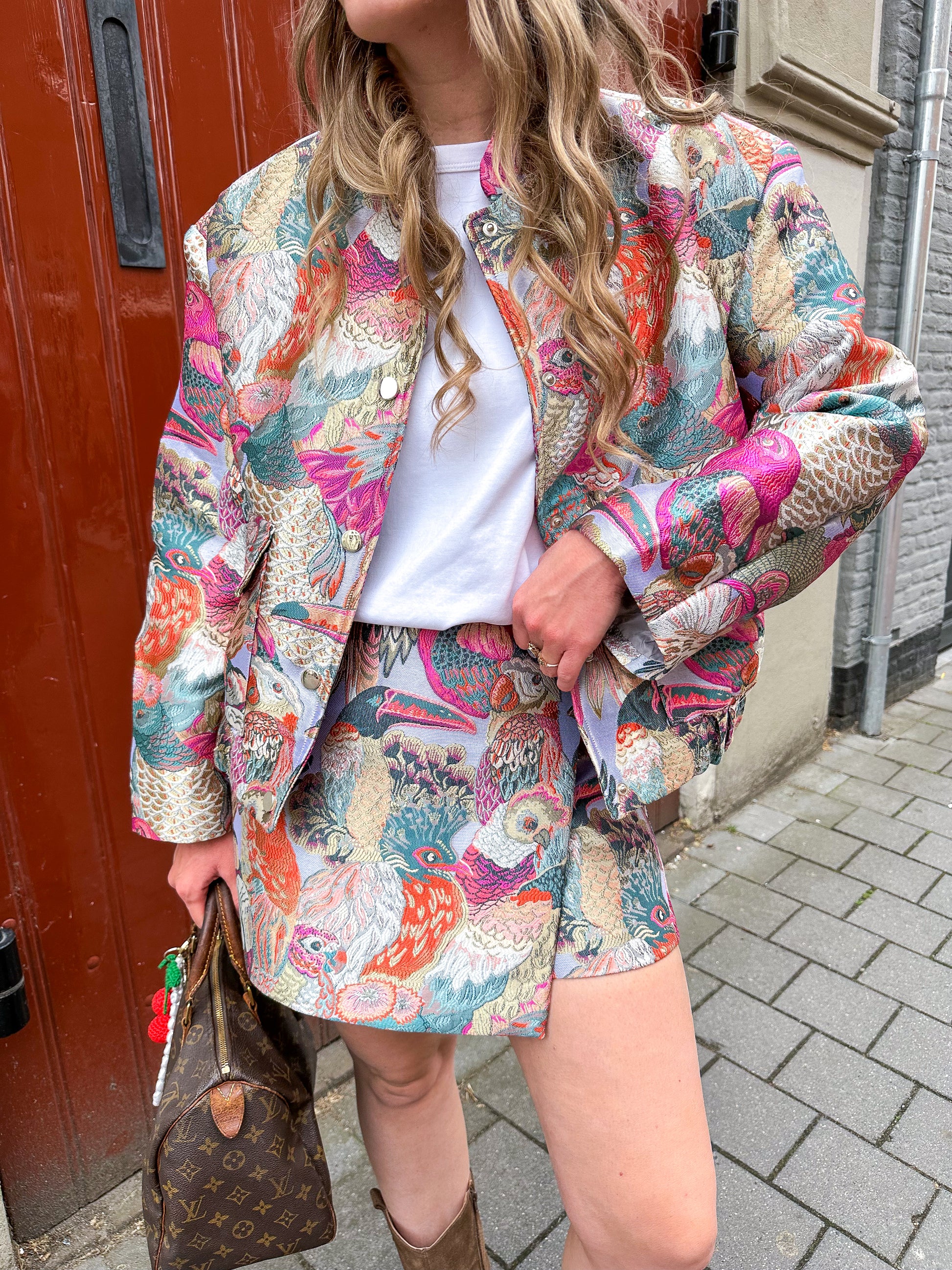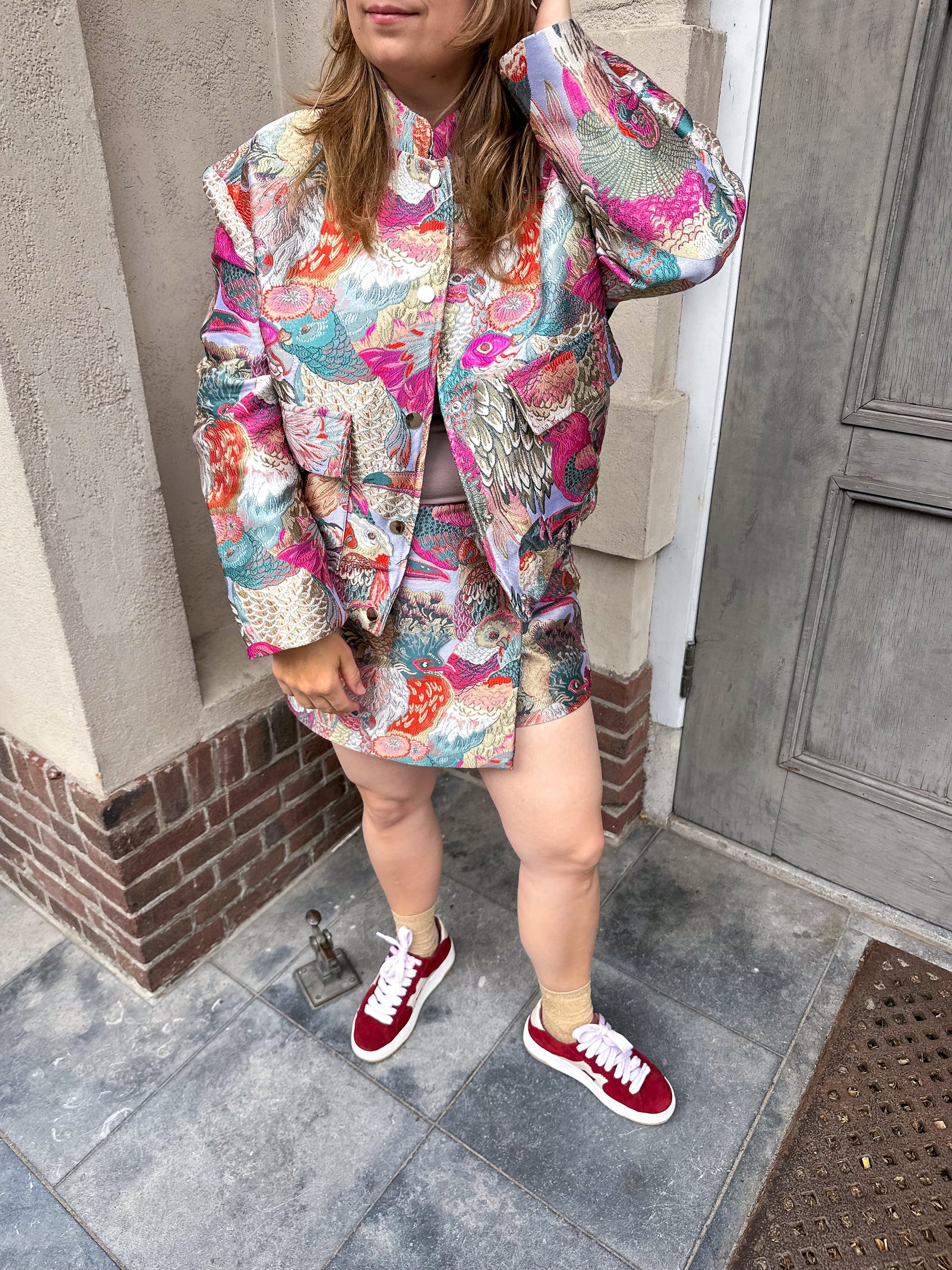 Dit bomber jasje is gemaakt van een stevige jaquard stof. De kleurrijke birds print zorgt ervoor dat het een echt statement piece is. De bomber heeft twee zakken en drukknopen.