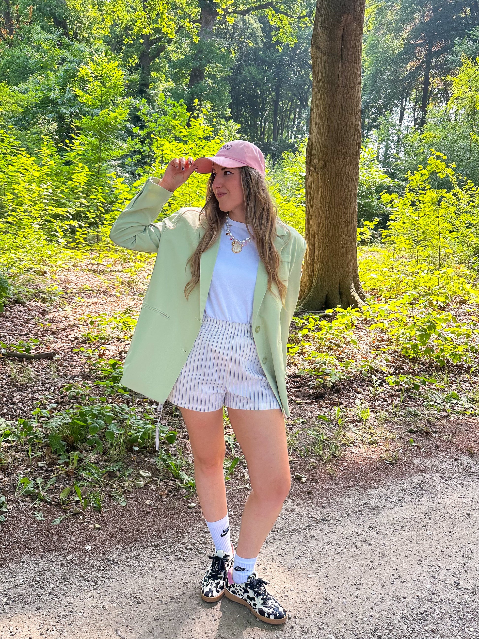 Pastel kleurige groene blazer met twee knopen en klein splitje aan de achterkant. Heel leuk te combineren met bijvoorbeeld zoals op de foto’s met de gestreepte shorts.