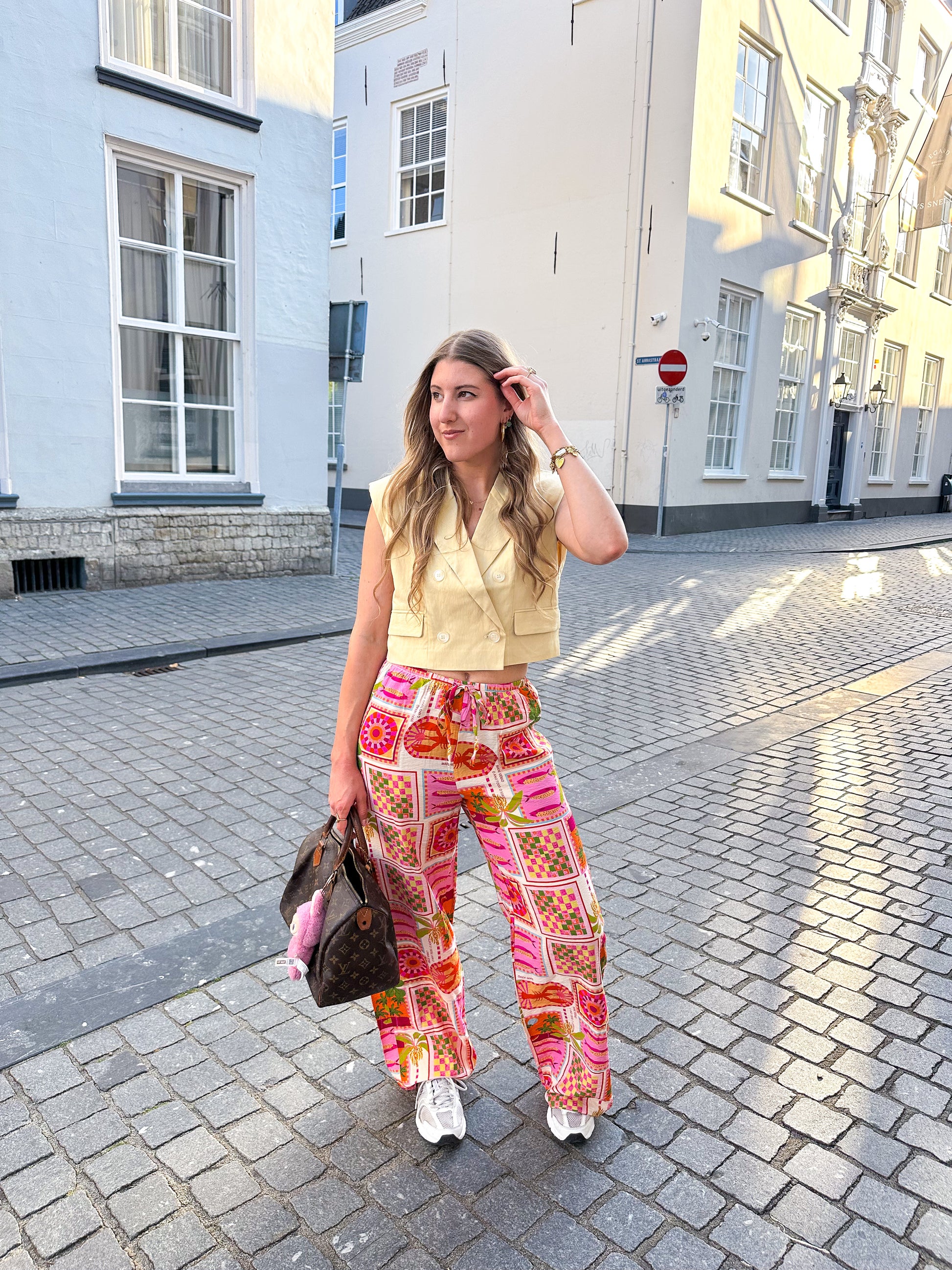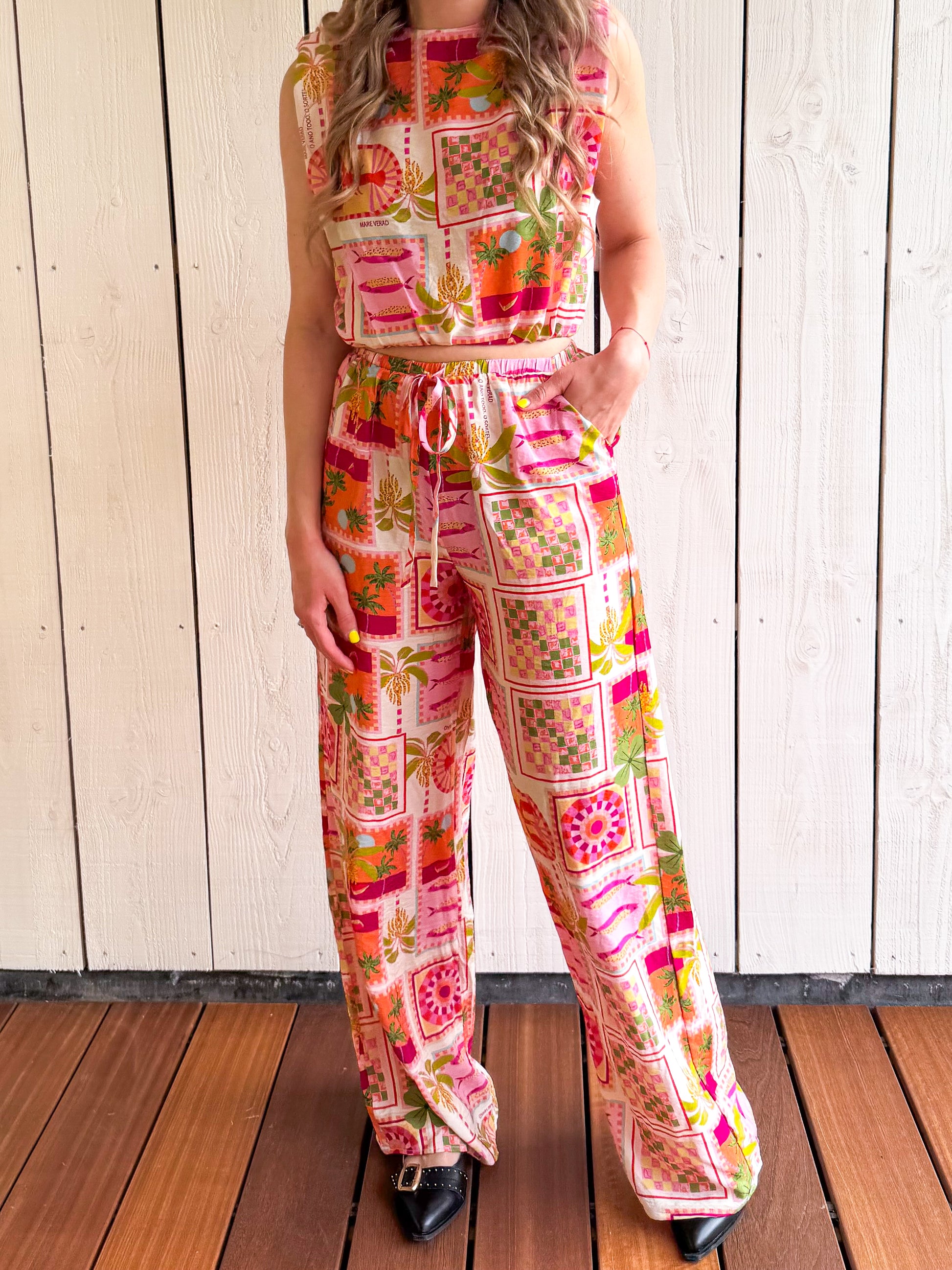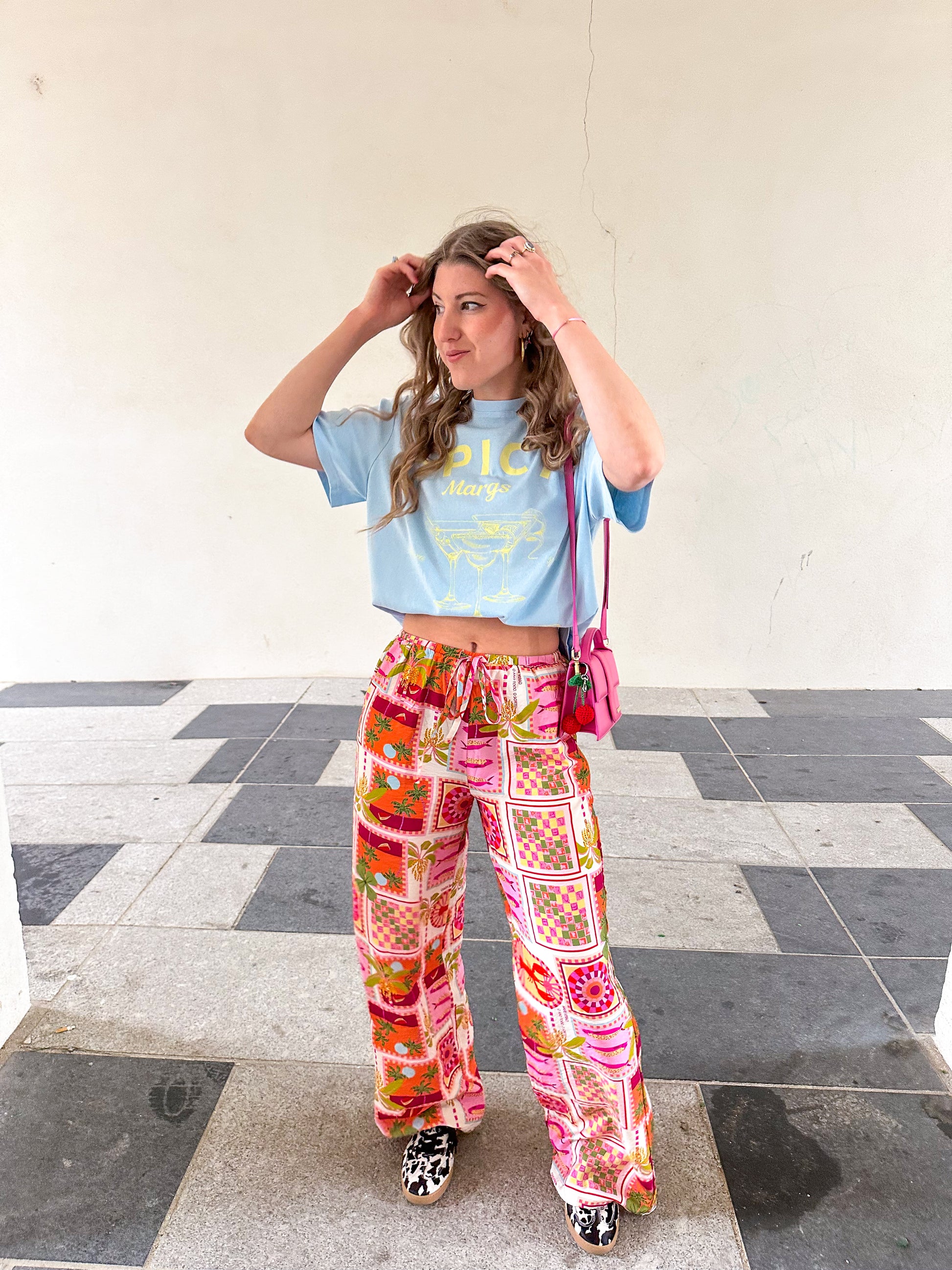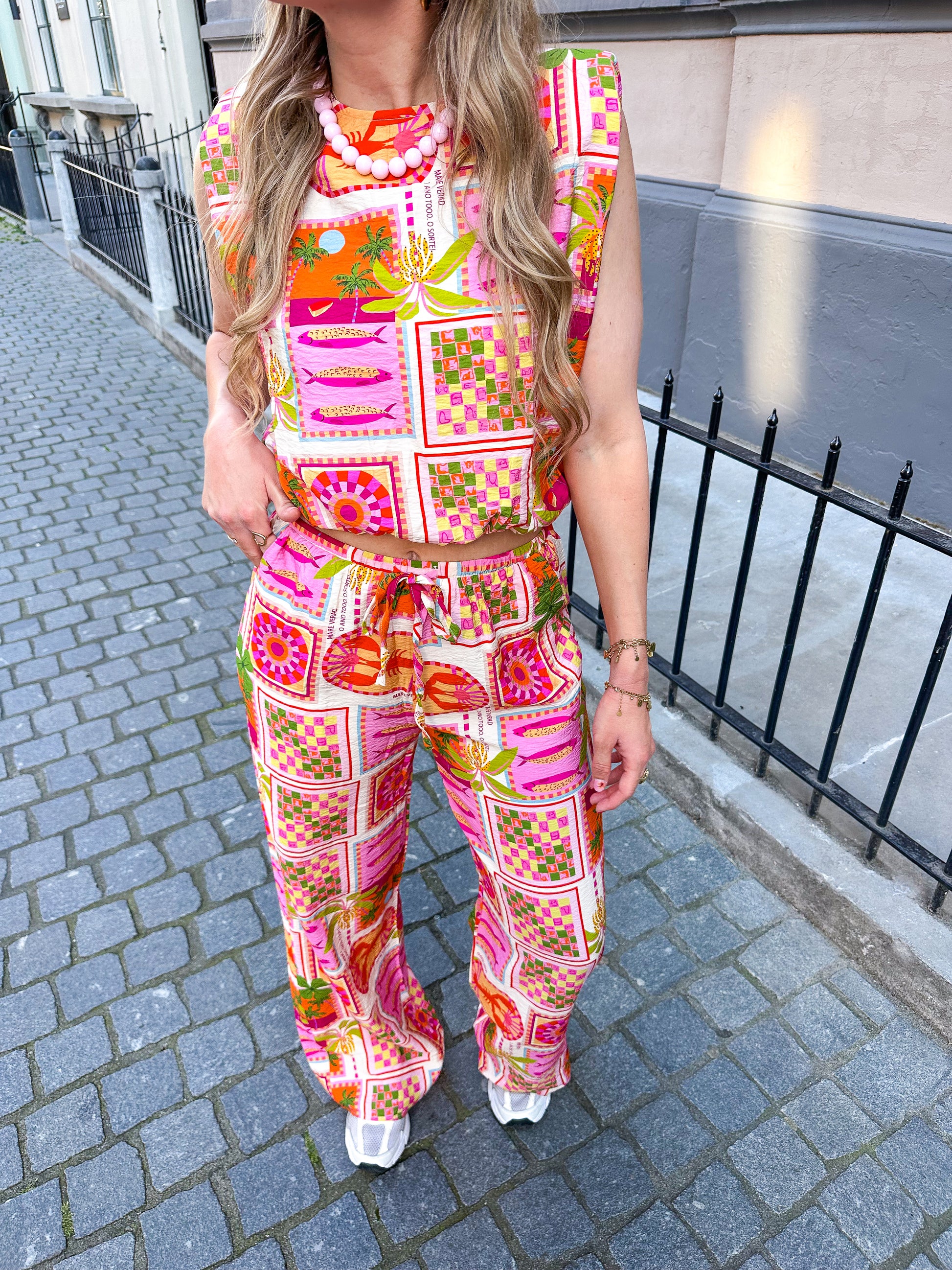Deze luchtige broek is is deel van een super vrolijke co-ord set met bijpassende top. De broek heeft een lange zwaaiende pijpen en een mediterrane print met print met kreeften, palmbomen, vissen en vormen. Aan de bovenkant zit een een elastische band met trekkoord waardoor de broek altijd mooi aansluit.