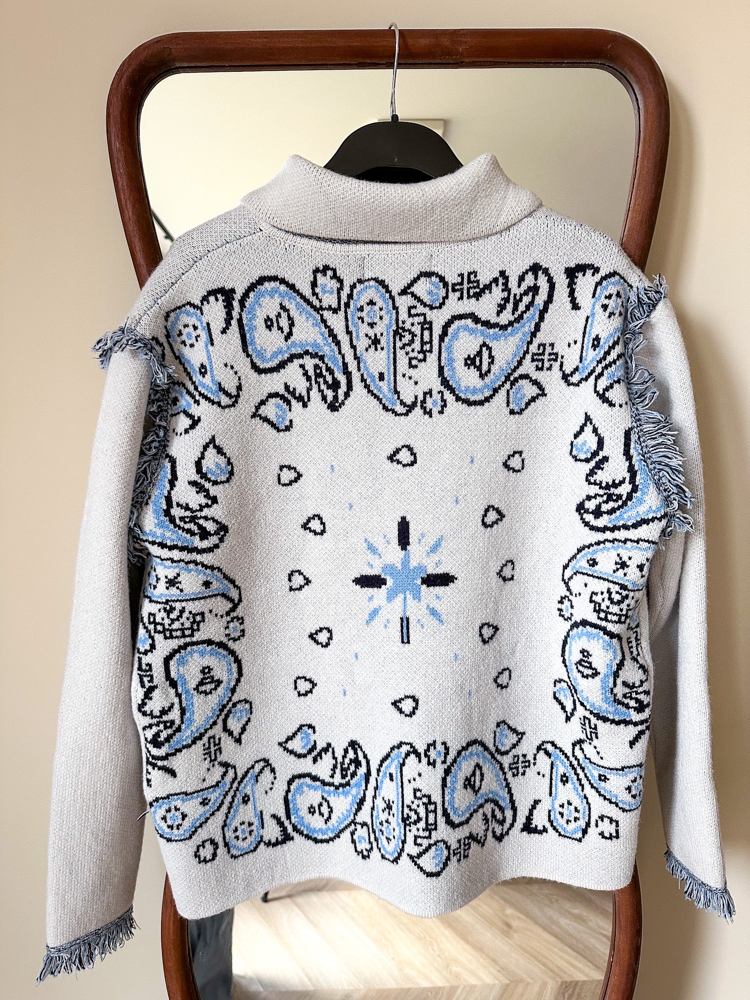 Dit vest heeft de ultieme boho paisley print in de kleur licht grijs met blauwe en zwarte details. Dankzij de stevige dikke jacquard stof, kun je deze ook perfect aan als jacket tijdens de warmere lente dagen of ideaal voor de koude zomer avonden. De bandana-print en franjes aan de mouwen en zakken geeft het vestje een casual uitstraling. Het vest heeft knoopsluitingen en twee zakken aan de voorkant.