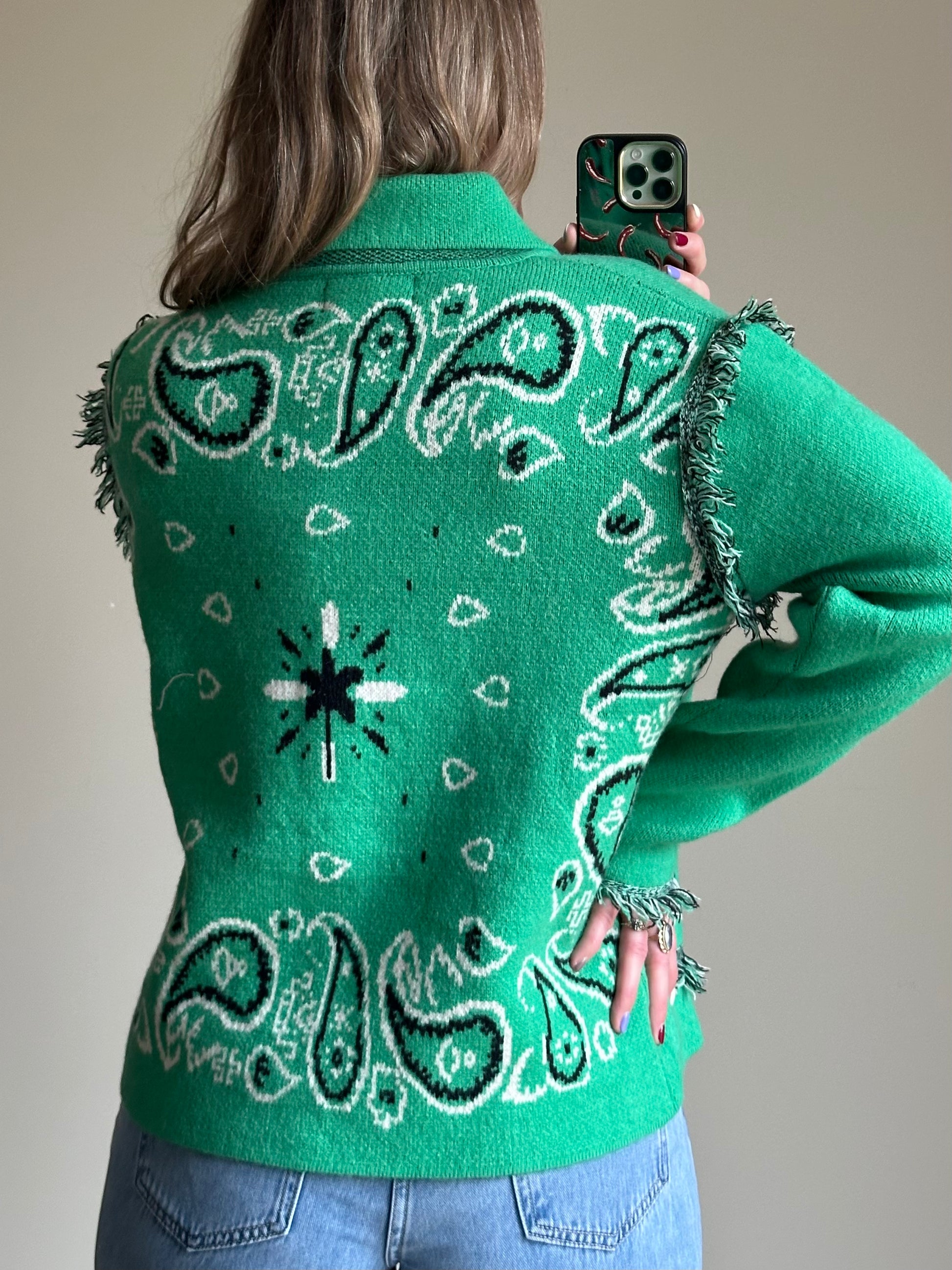 Dit vest heeft de ultieme boho paisley print in de kleur groen met witte en zwarte details. Dankzij de stevige dikke jacquard stof, kun je deze ook perfect aan als jacket tijdens de warmere lente dagen of ideaal voor de koude zomer avonden. De bandana-print en franjes aan de mouwen en zakken geeft het vestje een casual uitstraling. Het vest heeft knoopsluitingen en twee zakken aan de voorkant.