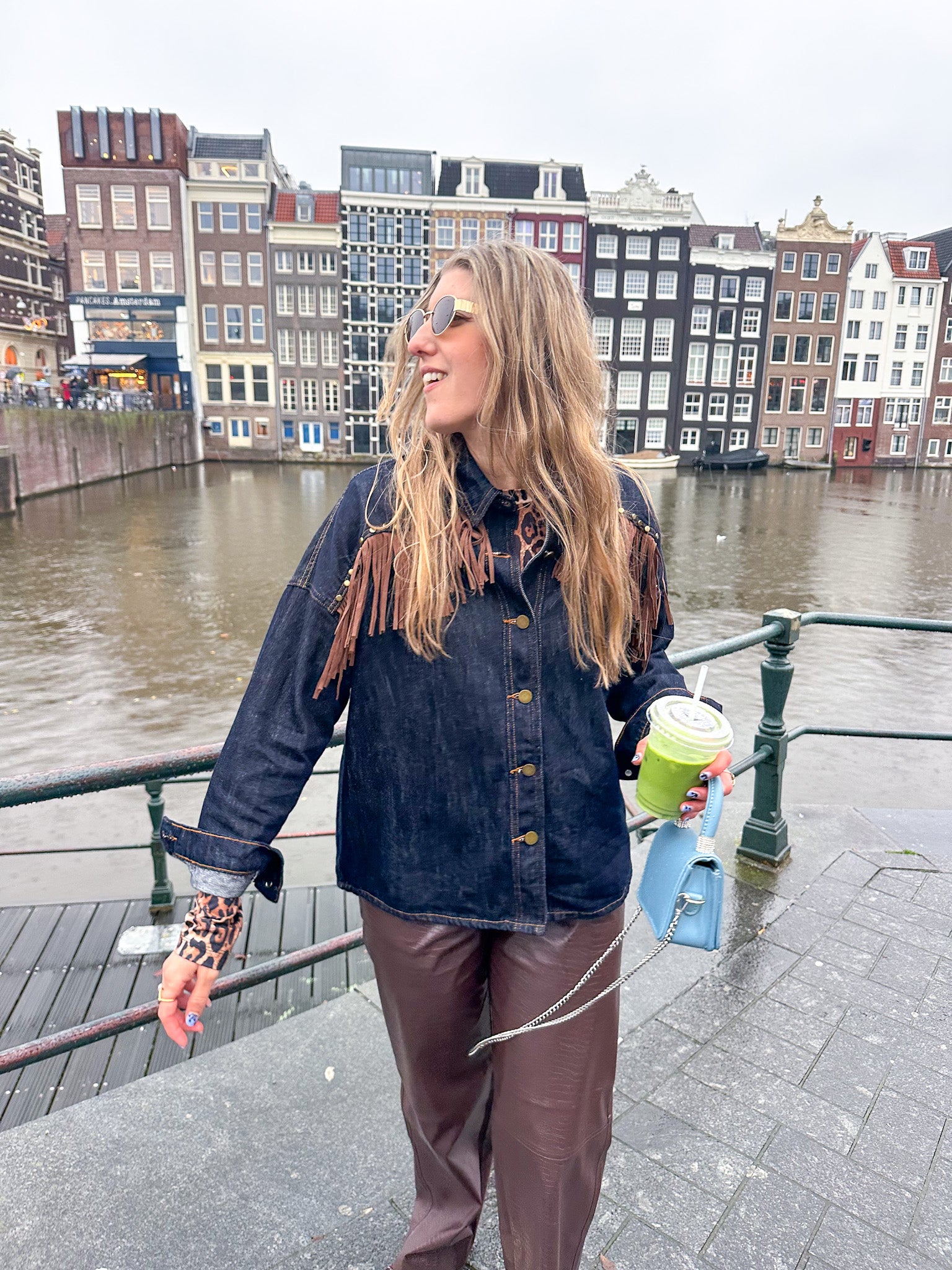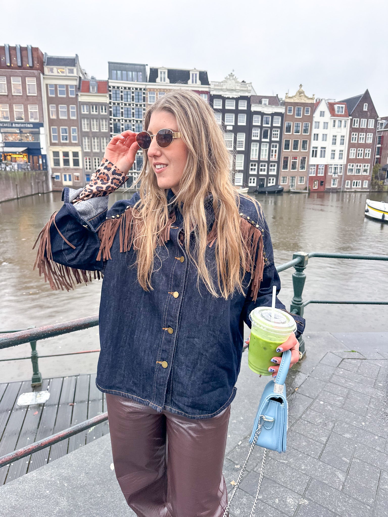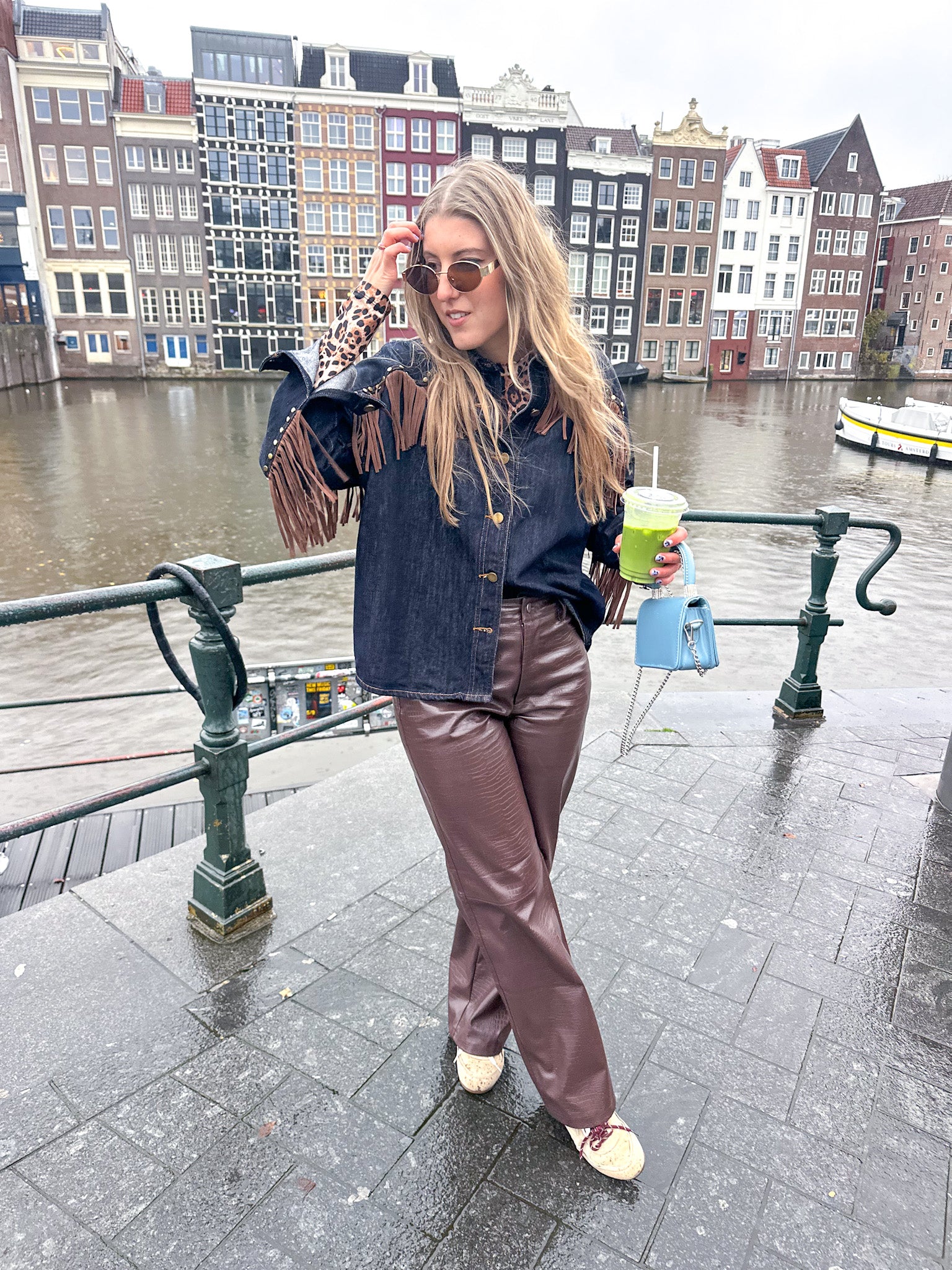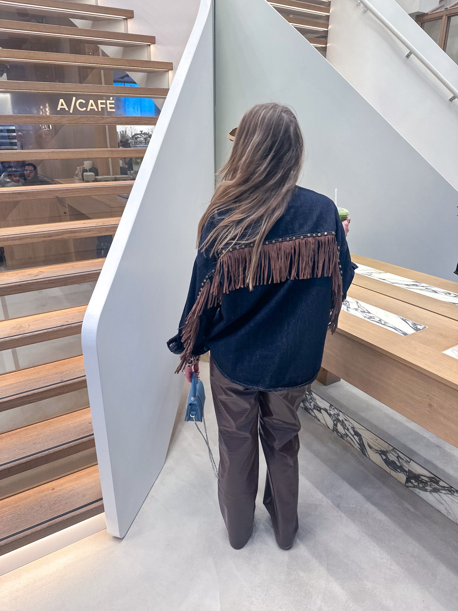 The western edit! Denim en fringe zijn altijd een goed idee. Dit donker blauwe spijkerstof blousje heeft aan de voor- en achterkant bruine suede fringe details. Het jasje heeft knoopsluitingen en goud kleurige studs. Draag op koudere dagen over je jurkje of broek. Ook heel leuk met andere kleuren denim te combineren.