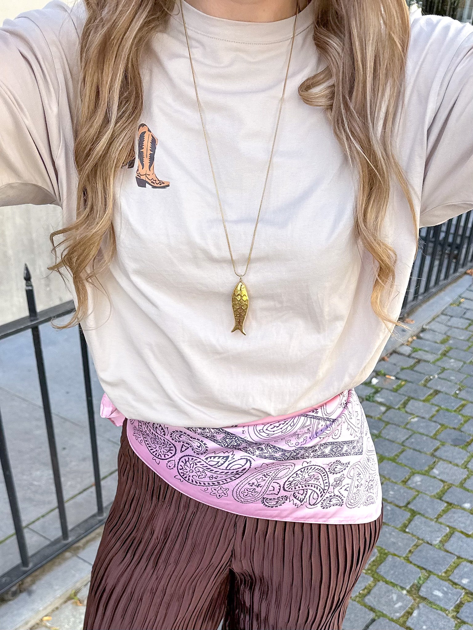 Lange kettingen zijn een musthave voor dit seizoen. We spotten deze leuke goudkleurige ketting met een forel vis eraan overal. Of je hem nu wil dragen met verschillende andere kettingen of juist als statement ketting draagt. Verkleurd niet.